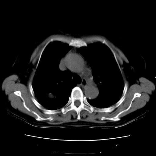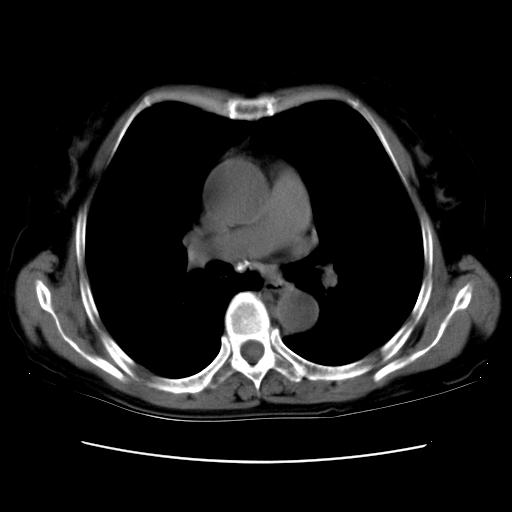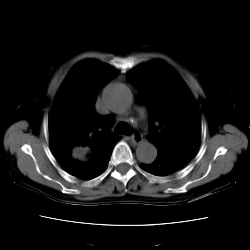 以下是引用夏季在2007-9-18 11:00:00的发言:[br]1。右肺肿块,周围有短毛刺,肺门侧有血管与其相连,胸壁侧有胸膜凹陷征,考虑周围性肺癌 2。左侧甲状腺软组织肿块,内有高密度钙化灶,考虑左侧甲状腺腺瘤。