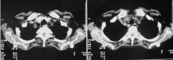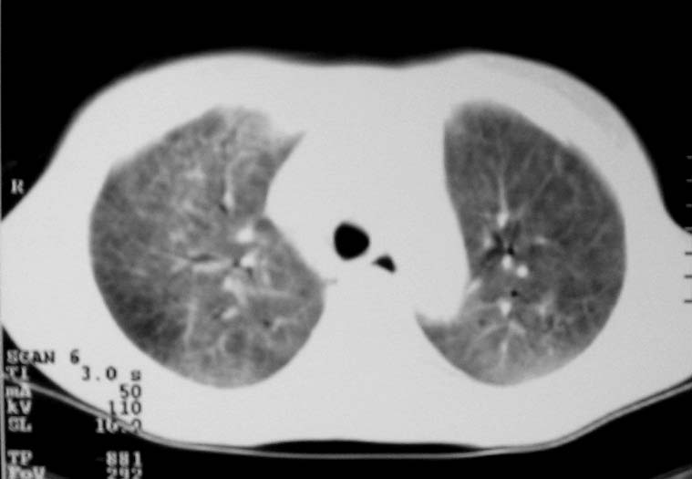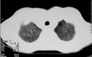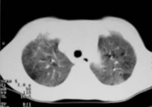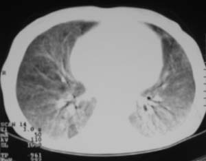 以下是引用逸风在2007-9-20 20:45:00的发言:[br]两肺磨玻璃样改变,临床病史短,发热,考虑病毒感染合并右肺代偿性肺气肿.待排肺水肿,病史短,不支持肺泡蛋白沉着症.