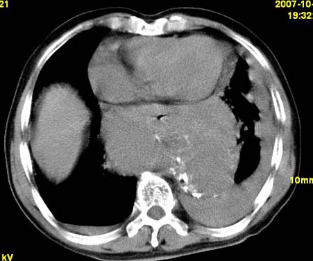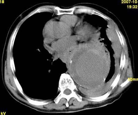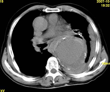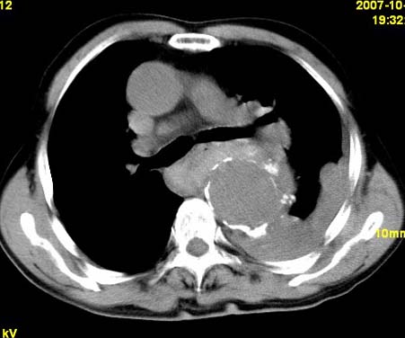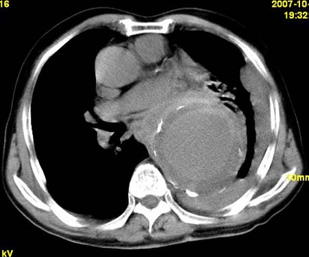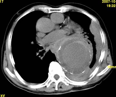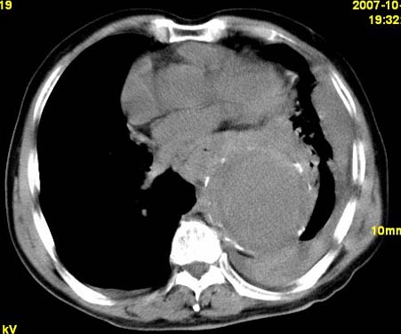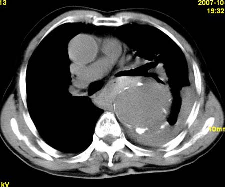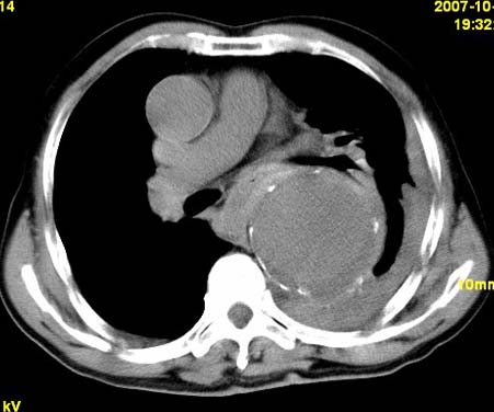 以下是引用qiuleiyu在2007-10-25 20:15:00的发言:[br]典型降主动脉瘤伴血栓形成.瘤体下部局部边缘不清,结合病史,不除外局部撕裂外渗可能.另左侧胸水,肺部压迫不张改变.建议增强进一步检查.