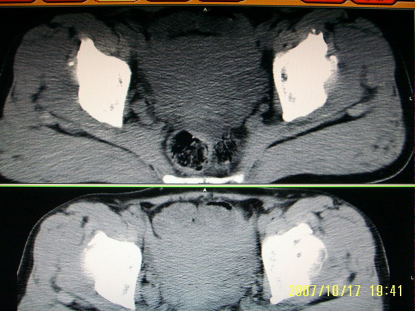 两侧髋臼结构发育不良伴退行性改变.不除外色素沉着绒毛结节性滑膜炎.
