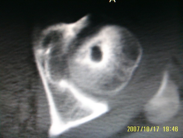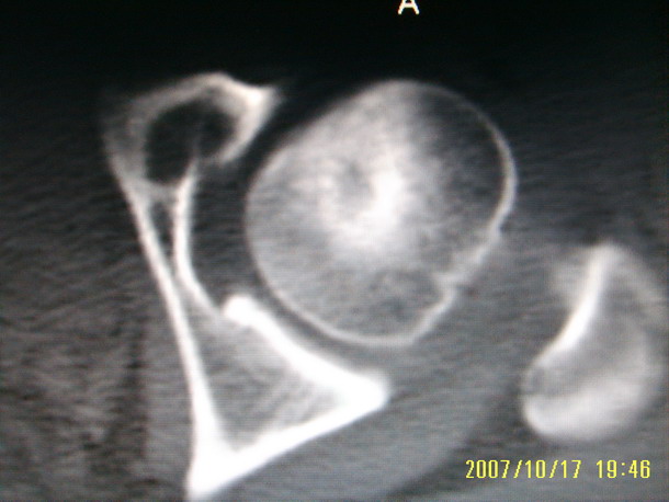 股骨头形态尚可,骨皮质环厚度及完整性可,病灶区以外骨质尚未见明显异常,临近髋臼骨质亦可见类似改变,考虑1.动脉瘤样骨囊肿,2.股骨头缺血坏死,