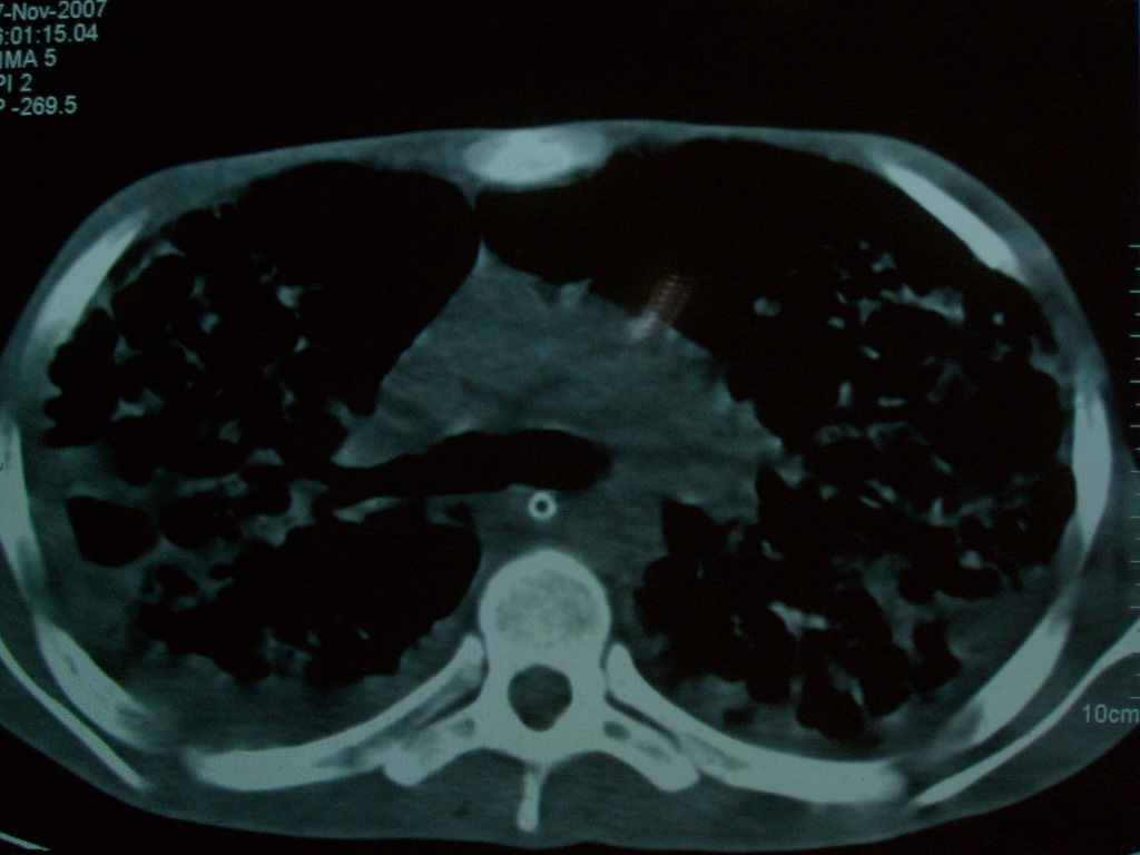 以下是引用齐原在2007-11-19 14:44:00的发言:[br]支气管囊肿伴感染,肺大泡,双下肺炎症