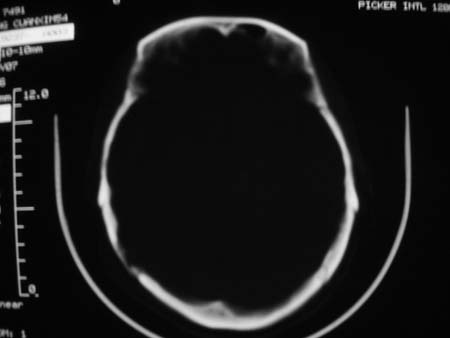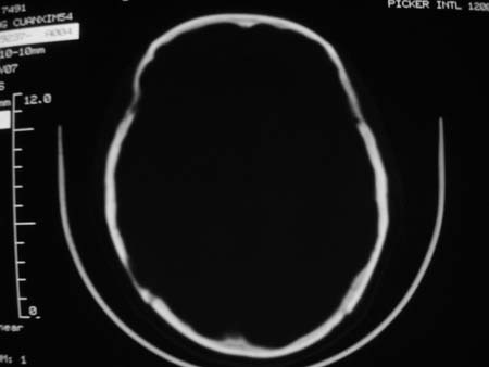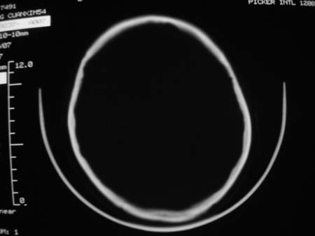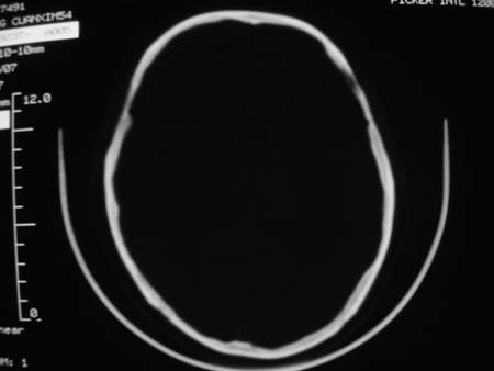 颅骨多处骨质不完整,内板变薄,右侧额颞部局部呈“穿凿样”骨质缺损,相应区硬膜外密度略增高。多考虑:骨髓瘤或骨嗜酸性肉芽肿!
