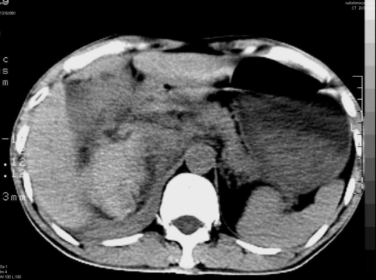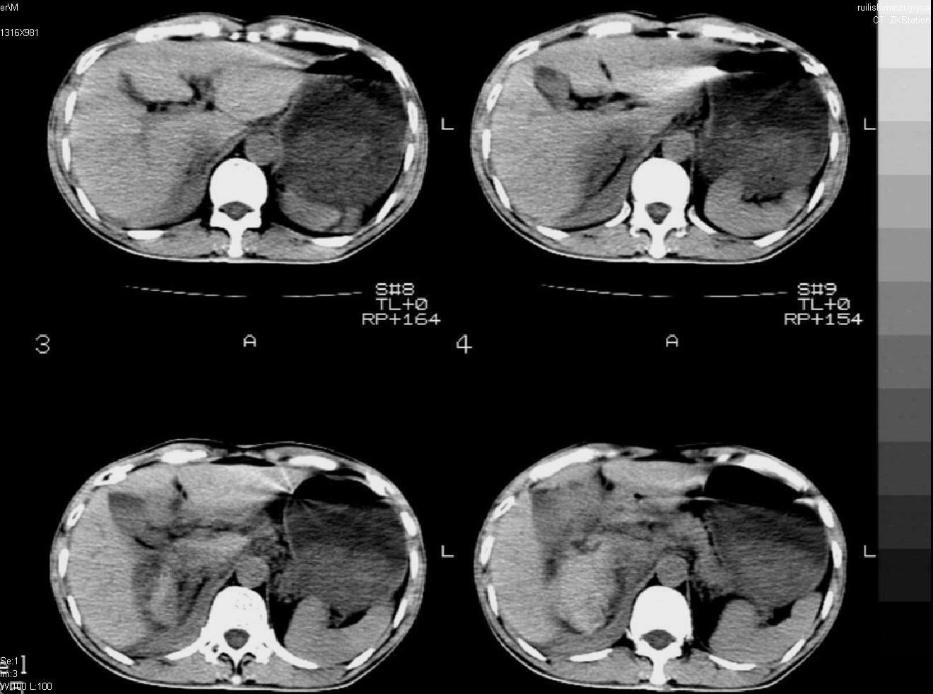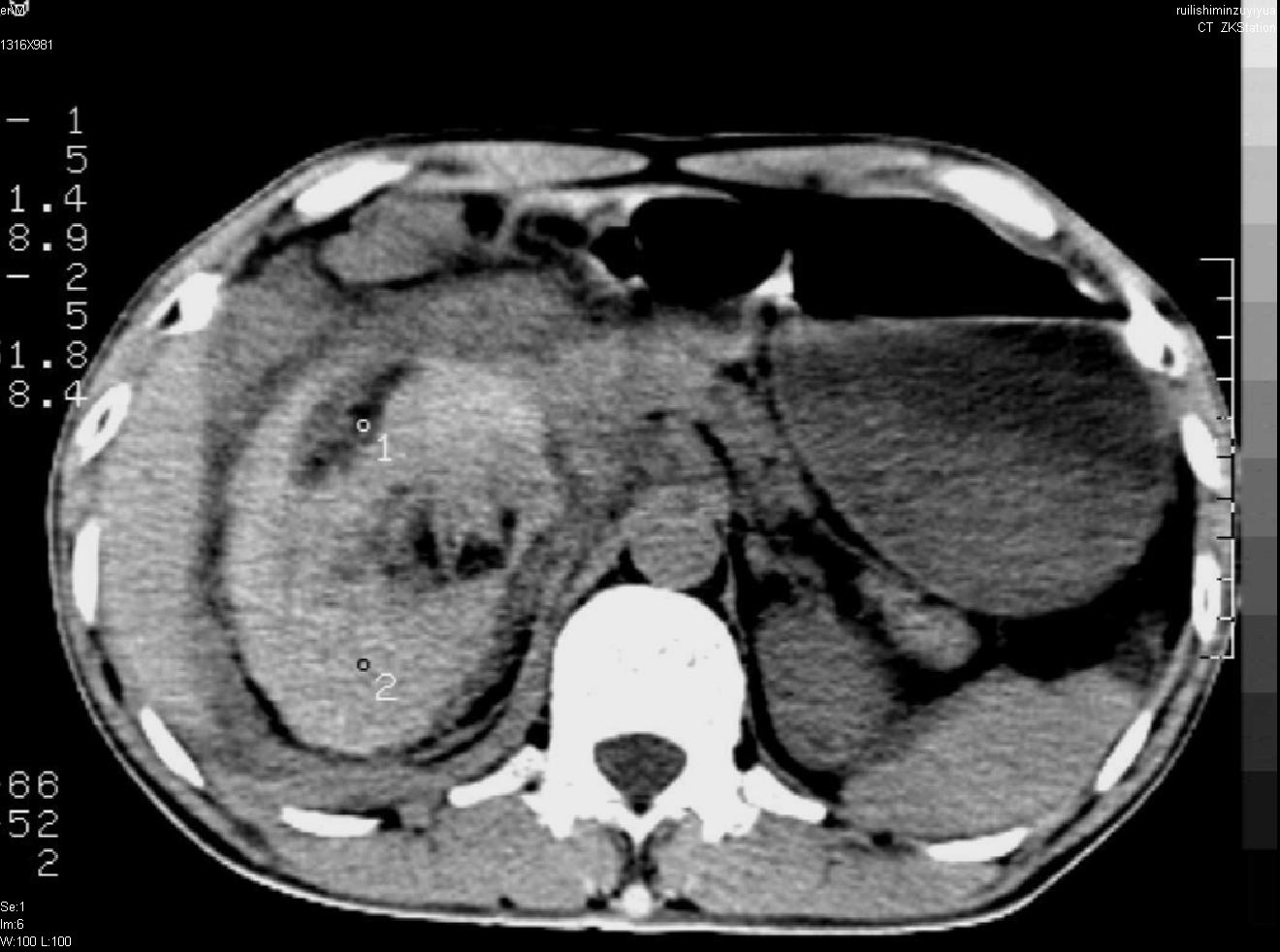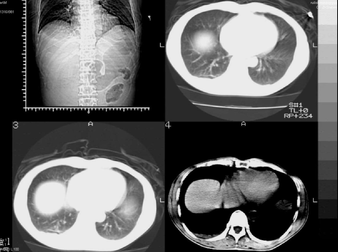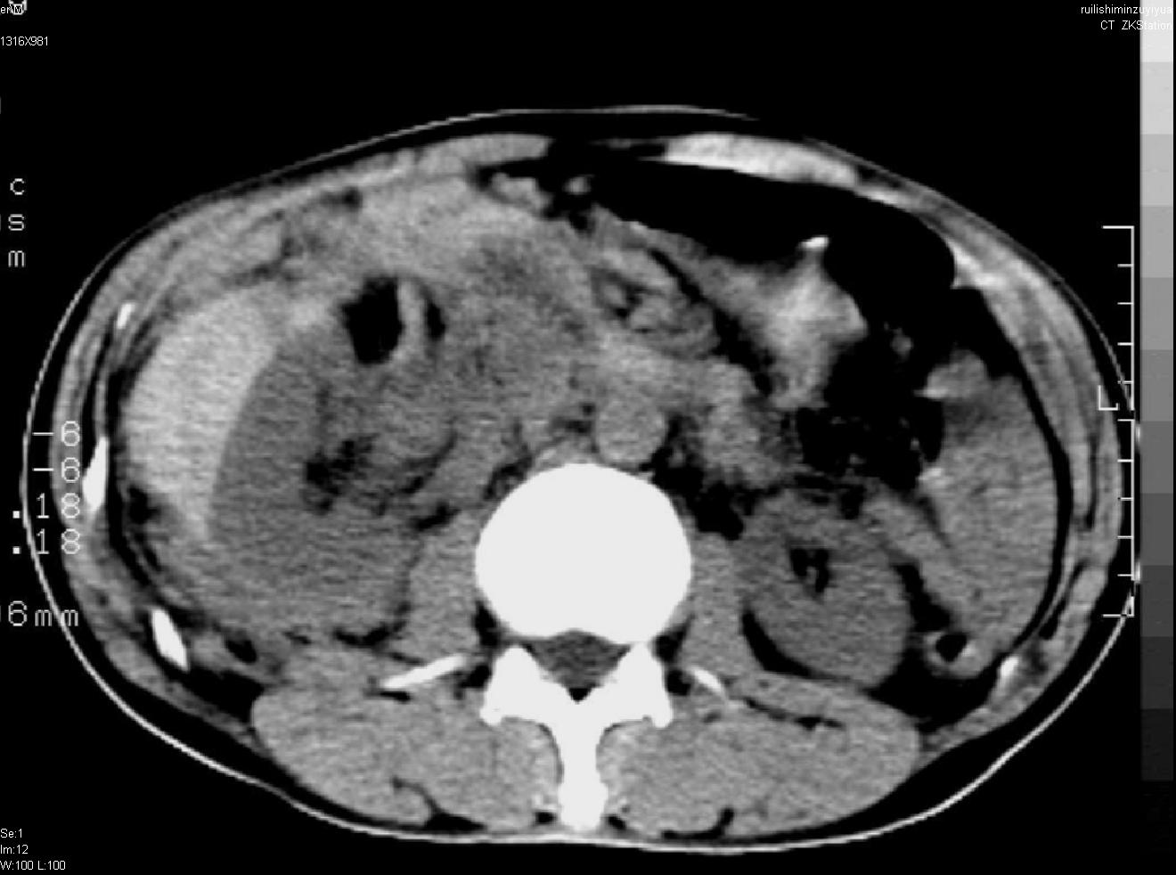 以下是引用liuyue在2007-12-3 6:27:00的发言:[br]右肾区可见密度不均匀、边缘欠清之肿块影,肾脏筋膜增厚,周围脂肪密度增高。右侧胸膜腔内可见少量液体密度影。考虑:1.右肾错构瘤(肾血管平滑肌脂肪瘤)可能性大。2.右侧少量胸腔积液。[br] 鉴别:1.肾脂肪肉瘤。2.肾平滑肌肉瘤。3.肾错构瘤恶变。