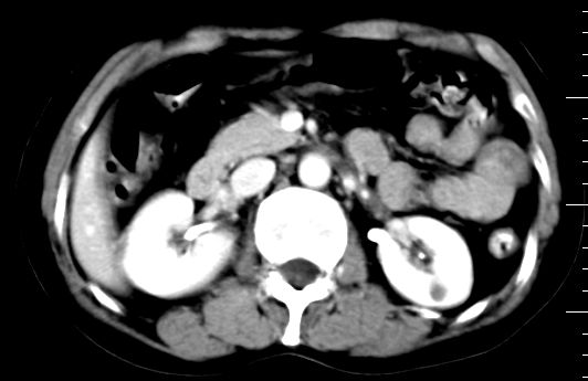 胰腺及脾未见异常。肾门水平腹膜后见小淋巴结。腹腔未见积液征象。
