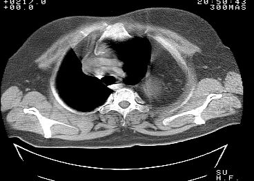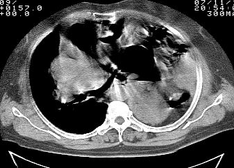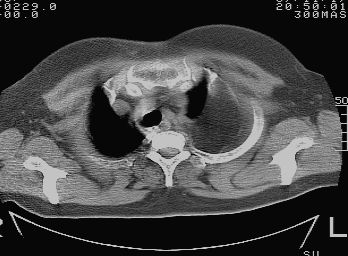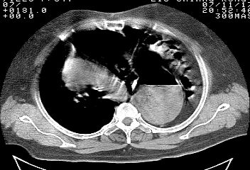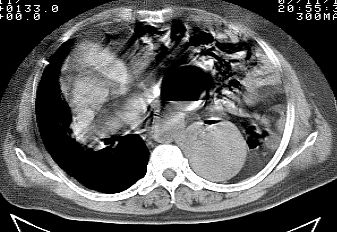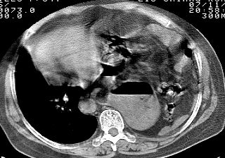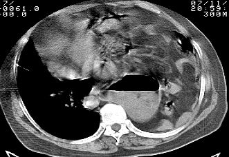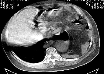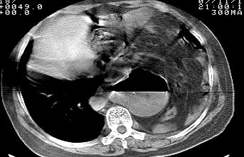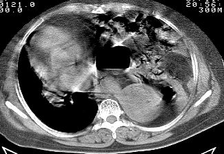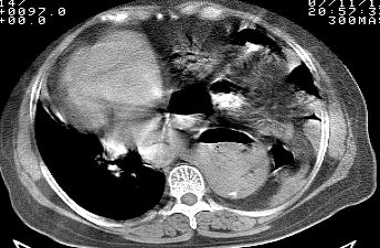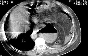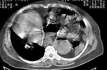 以下是引用宇宙ct在2007-12-6 18:39:00的发言:[br]典型左侧膈疝,疝出物为胃和大网膜,纵隔右移 [br] [br]稀钡剂造影就更好了