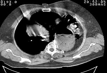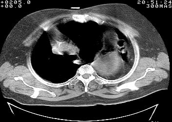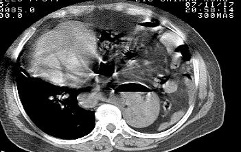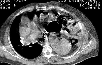 女, 64岁 三十年前胸部外伤史, 间断胸闷,