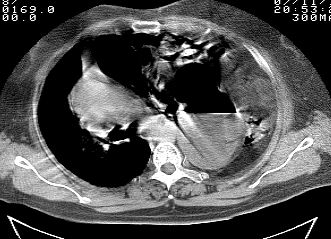 同意左侧膈疝,不过,有过外伤史,左肺有受压征象,同时有胸膜增厚。
