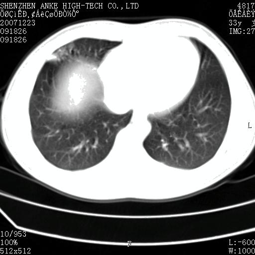 患者:男,19岁,长期咳嗽,咯血3年余,近2月渐渐感觉右侧胸部涨痛不适.2年前胸片见右下肺见片状高密度影,长期抗炎治疗无明显效果.痰菌培养阴性.