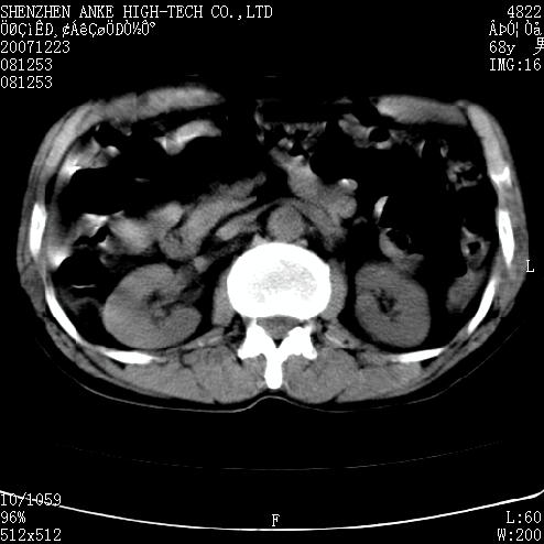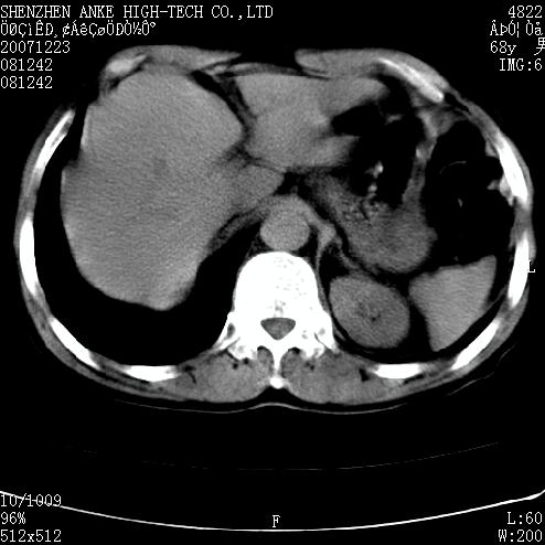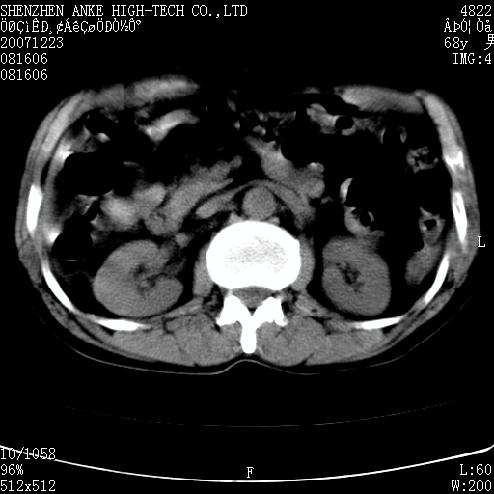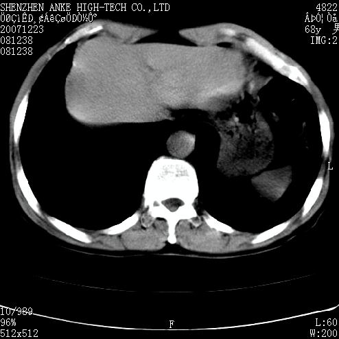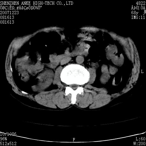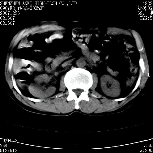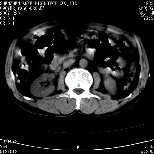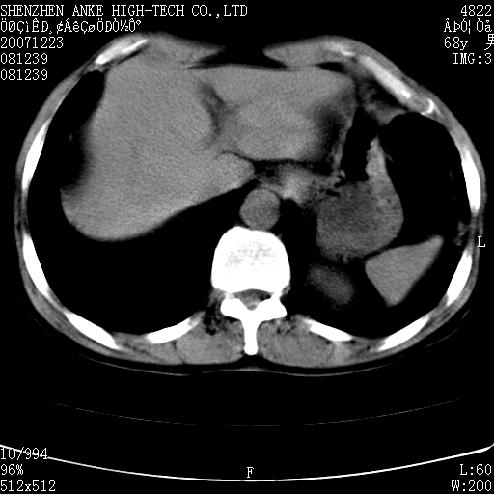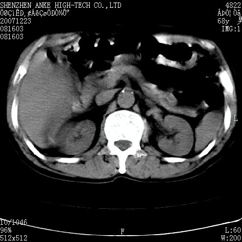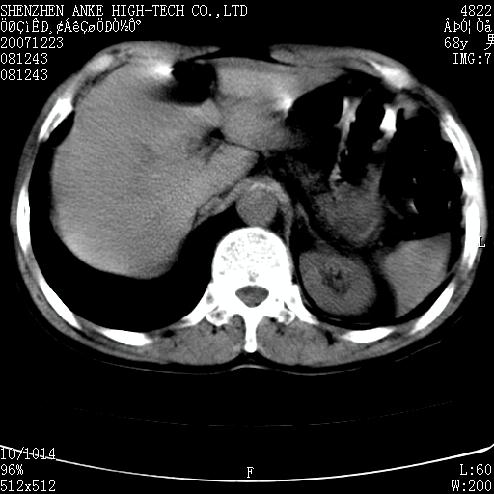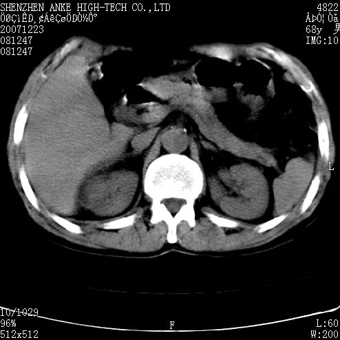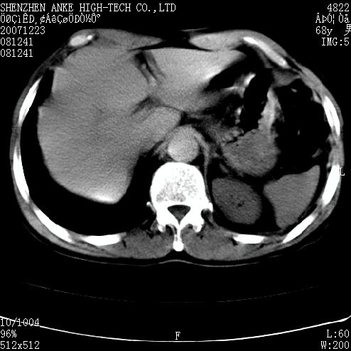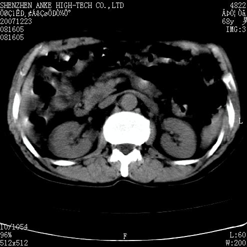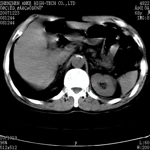 肠道准备不好,胃底后壁显示不清,右肾改变考虑为伪影。