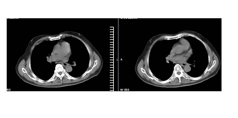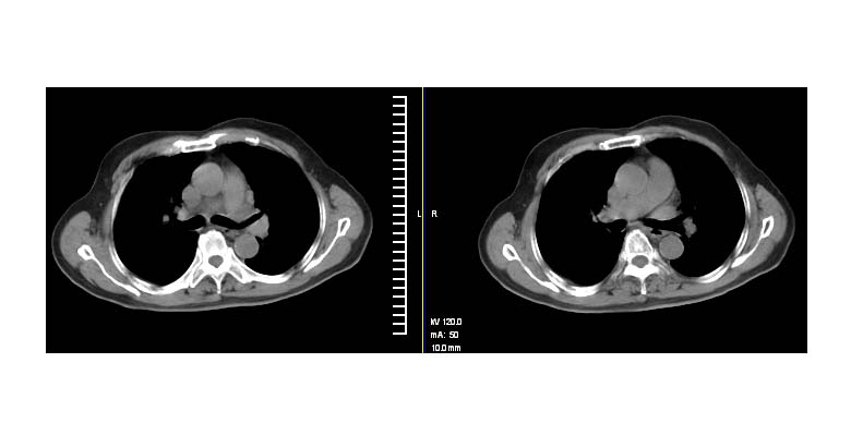 考虑左上肺癌,似与左侧肋骨关系密切?