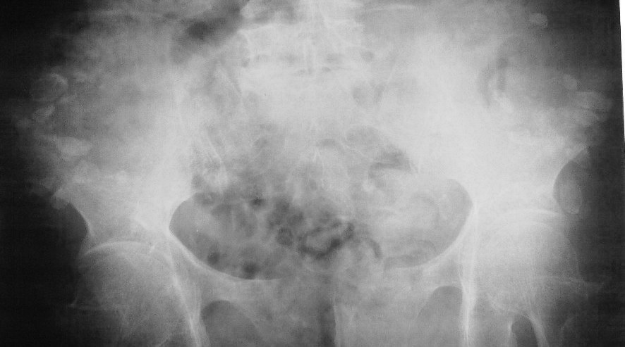 双侧髂翼重叠处可见对称性多发钙化灶,部分位于髂骨影外;