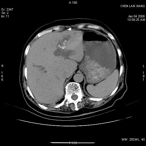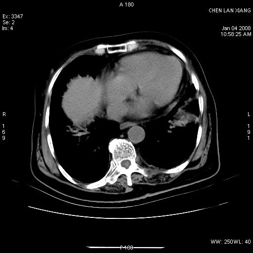 女,76岁,腹痛3-4天,b超示:肝内实性肿物,胆囊强回声,胆总管扩张.