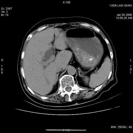胆囊密度增高,增强后周边肝组织及胆囊窝下部周边软组织延时性不规则强化.然胆囊壁未见明显不规则增厚及肿块.左侧肝内胆管及胆总管下段结石伴胆系扩张.
