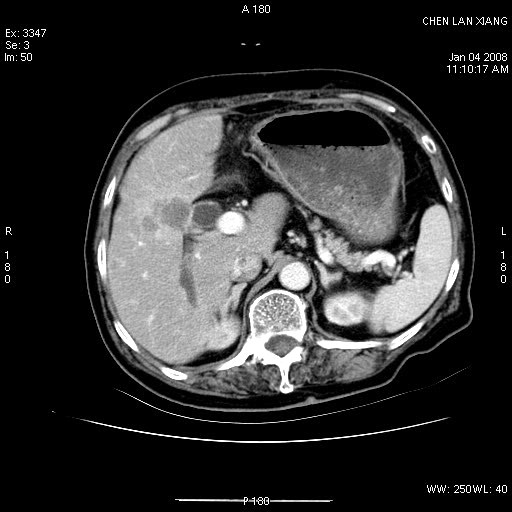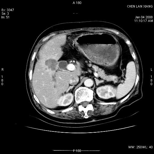 1)胆囊癌伴肝脏转移。2)胆总管下端结石、肝内胆管结石伴肝内外胆管扩张。