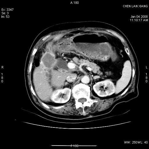 以下是引用卜一在2008-1-4 16:32:00的发言:[br]1 胆总管末端结石伴肝内胆管结石,肝内外胆管扩张。2 胆囊扩大,胆囊壁不规则增厚,内见软组织密度影。考虑:慢性胆囊炎,不除外胆囊癌!