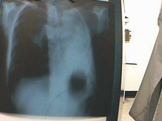 以下是引用前行在2008-1-12 18:03:00的发言:[br]左胸廓缩小,纵隔气管对称性左移,左肺野大片致密影,胃泡上移;右肺代偿性气肿。提示左肺不张,纵隔疝,左侧胸膜肥厚粘连。建议ct检查。