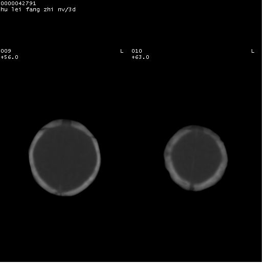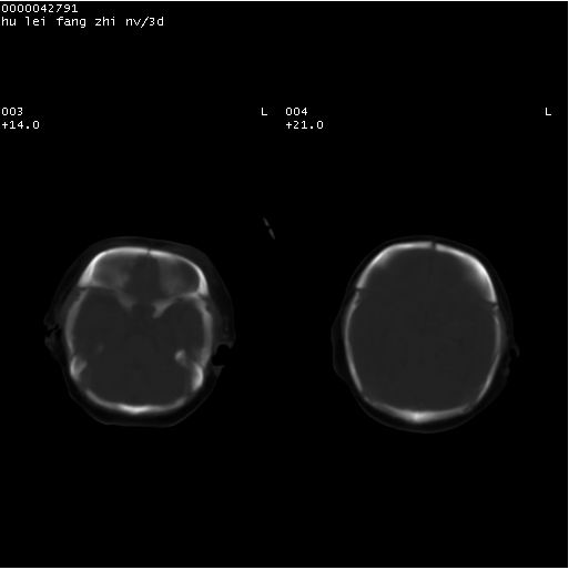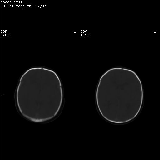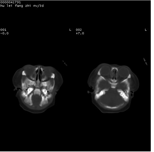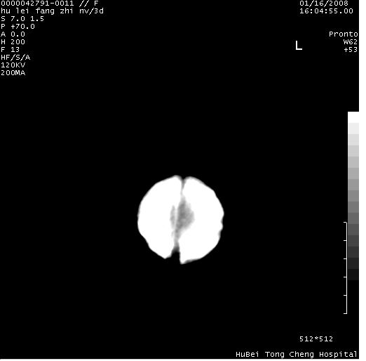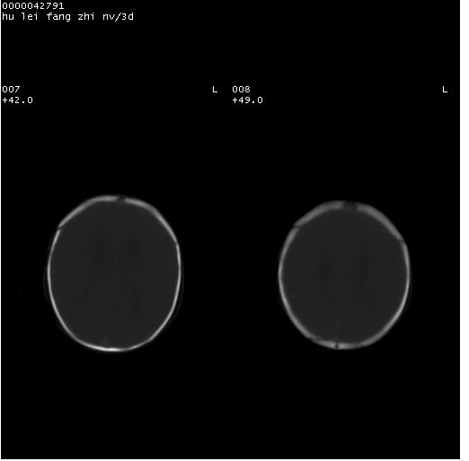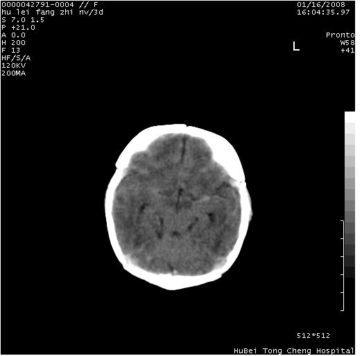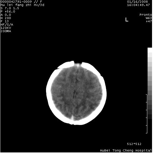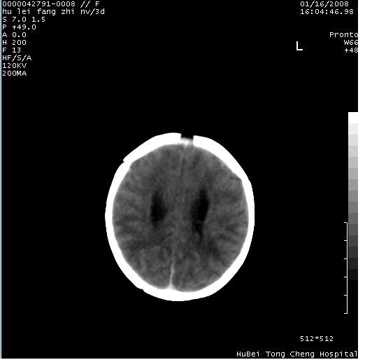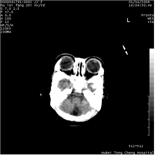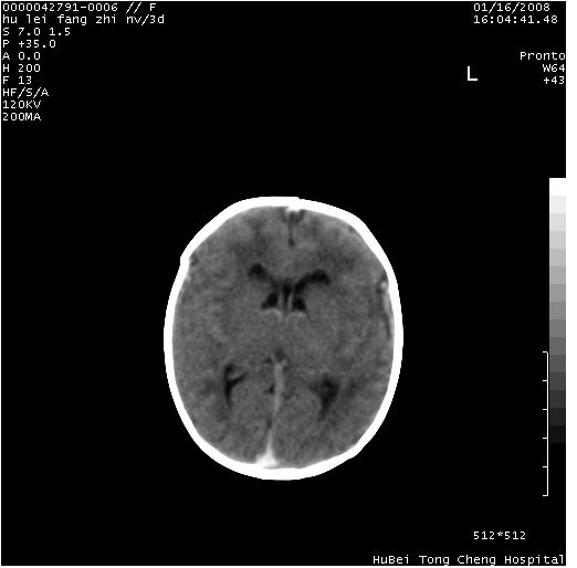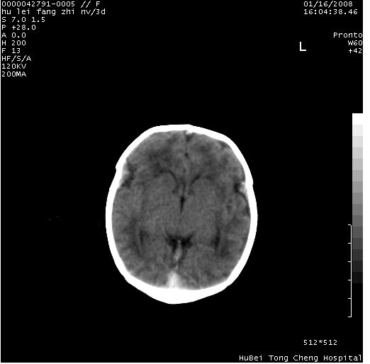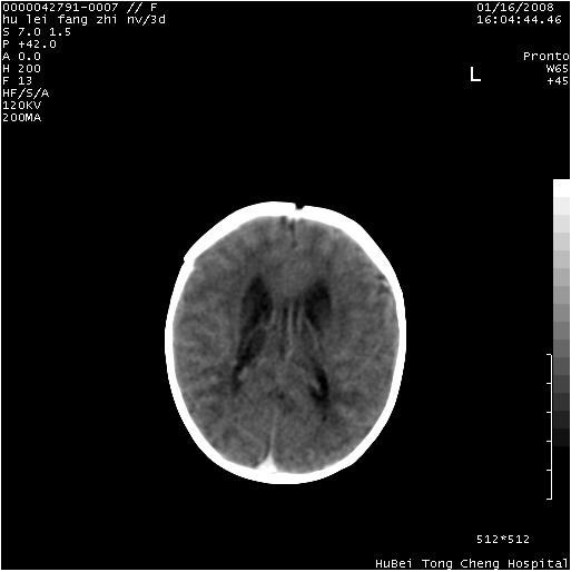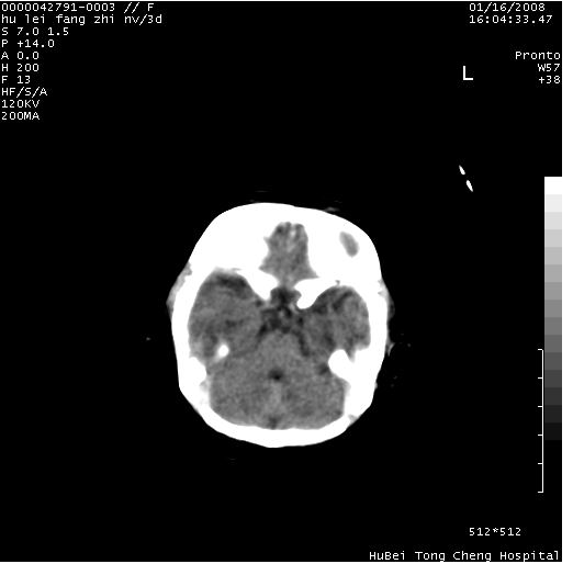 颅脑ct轴位平扫(层厚、层距均为7mm),图像如下: