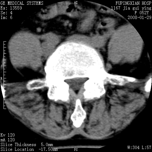 以下是引用dyqct在2008-1-29 21:49:00的发言:[br]考虑:1、腰4-5椎间盘突出(左椎间孔外侧型)。[br] 2、硬膜囊内钙化,多考虑蛛网膜炎所致粘连钙化,请询问病史病人以往做过碘油造影吗?