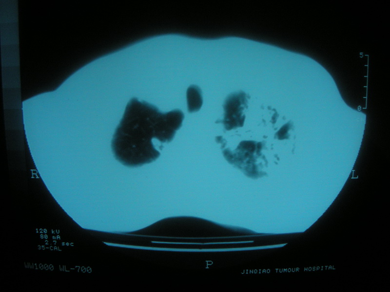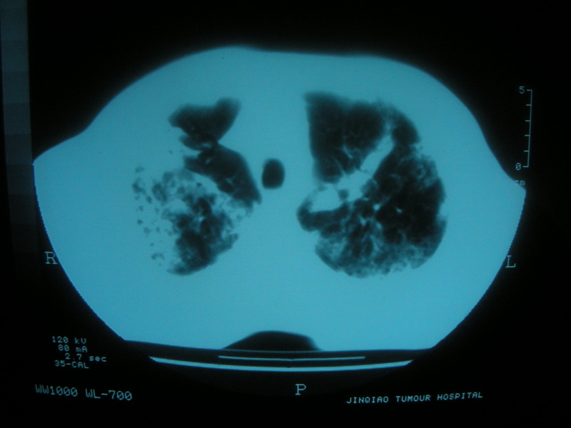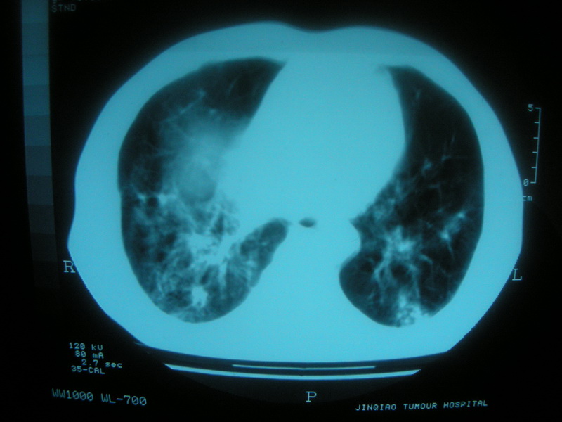 双肺继发性肺结核伴支气管播散。