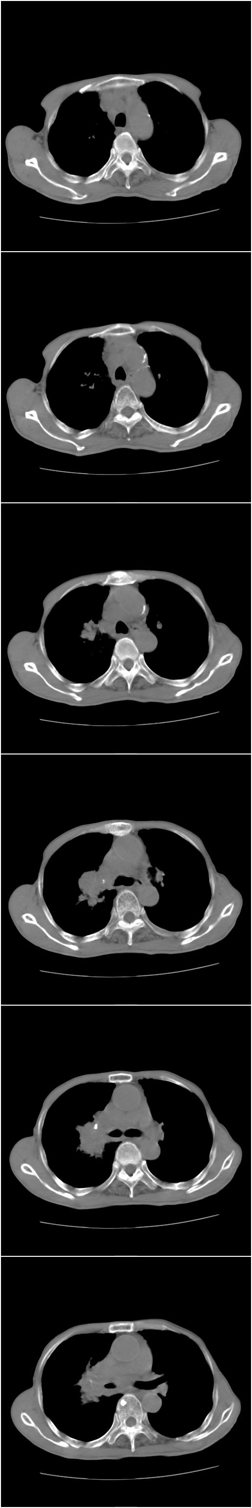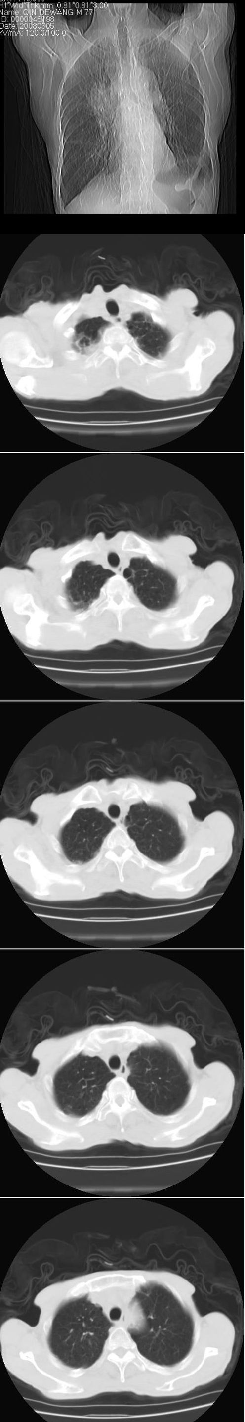 CT12024:男,77岁。咳嗽两月余,气喘一月,13年前岑作贲门