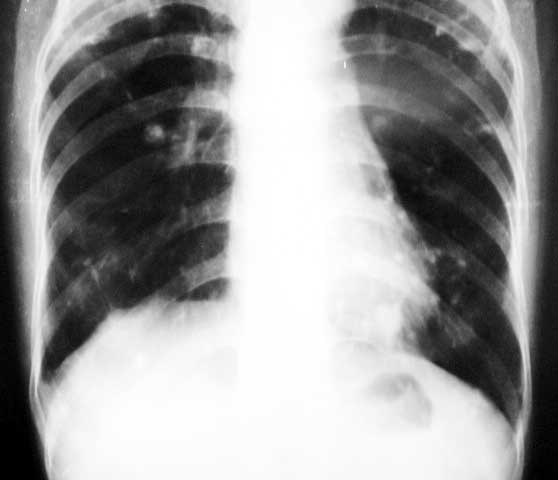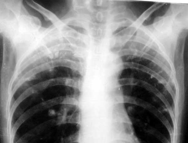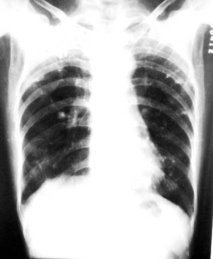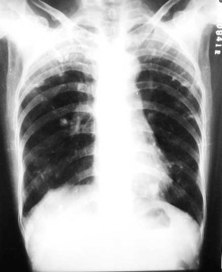 两上肺继发性肺结核;左肺门云雾样高密度影为何物?心后可见结节样高密度影是?请楼主告知详情![emb10]