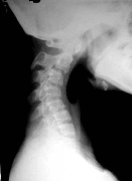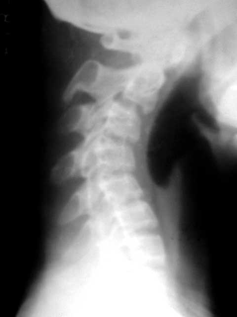 看侧位片下颌部下垂,肯定是头颈肌肉僵硬,病根还在颈部软组织。