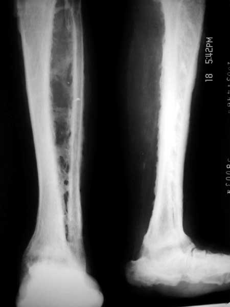 以下是引用caihe在2005-4-19 20:42:13的发言:[br]该病例胫腓骨之间见交叉骨质连接,其内似见杂乱骨纹,胫腓骨皮质增厚,骨髓腔模糊不清,跟骨形态边缘不整,结合外伤史考虑:左小腿(胫腓骨)骨化性肌炎.