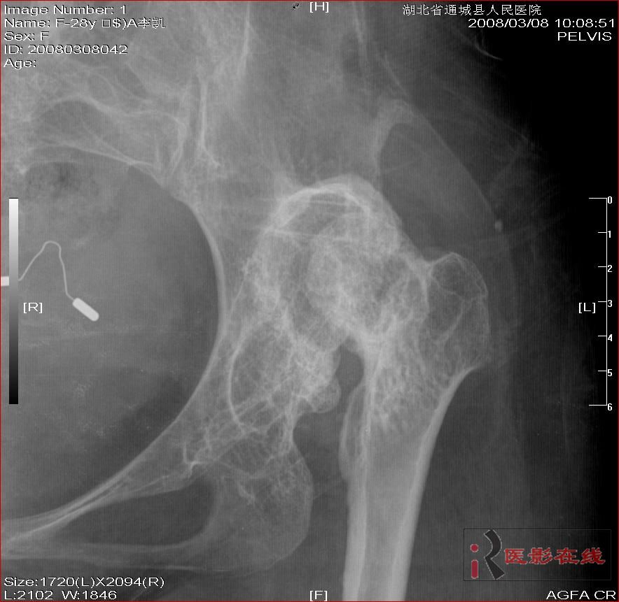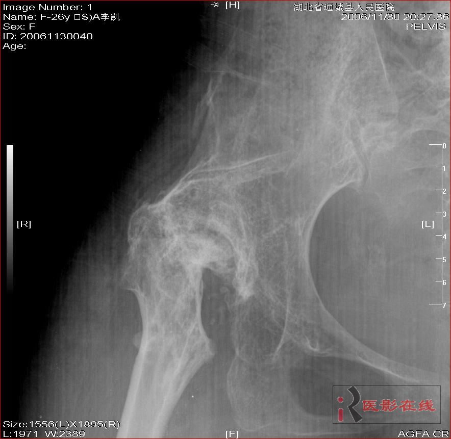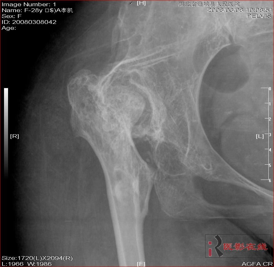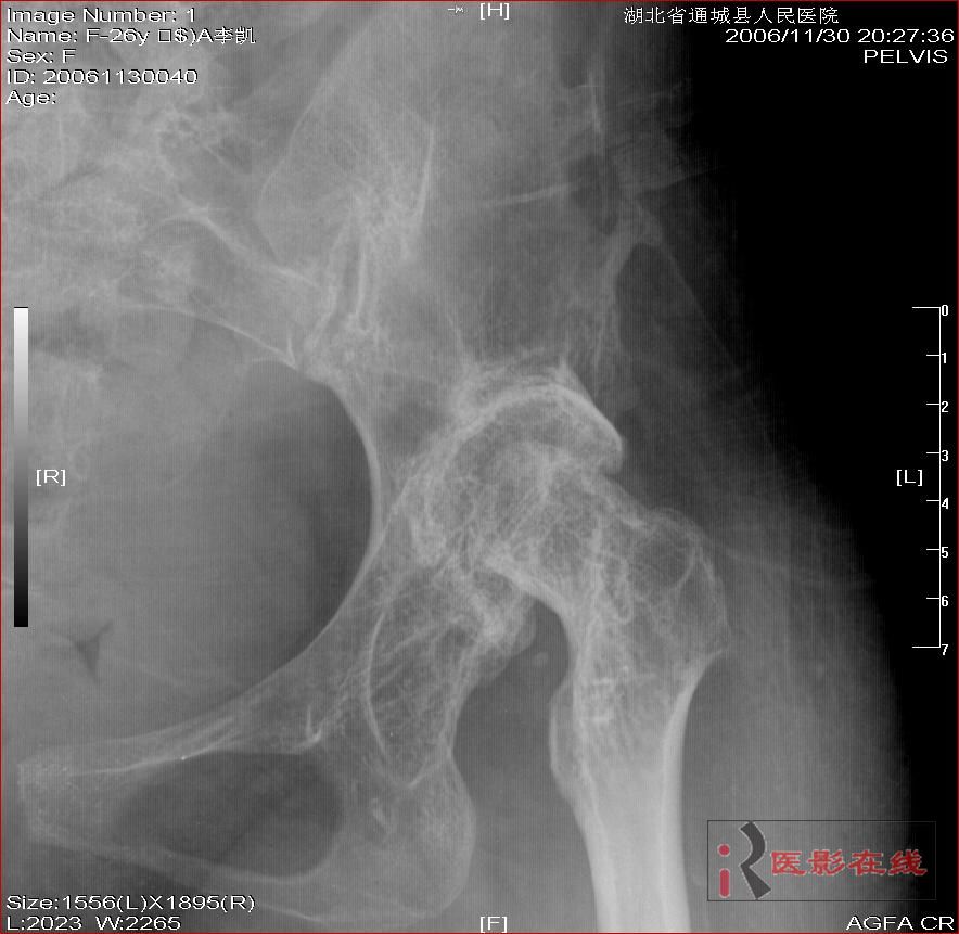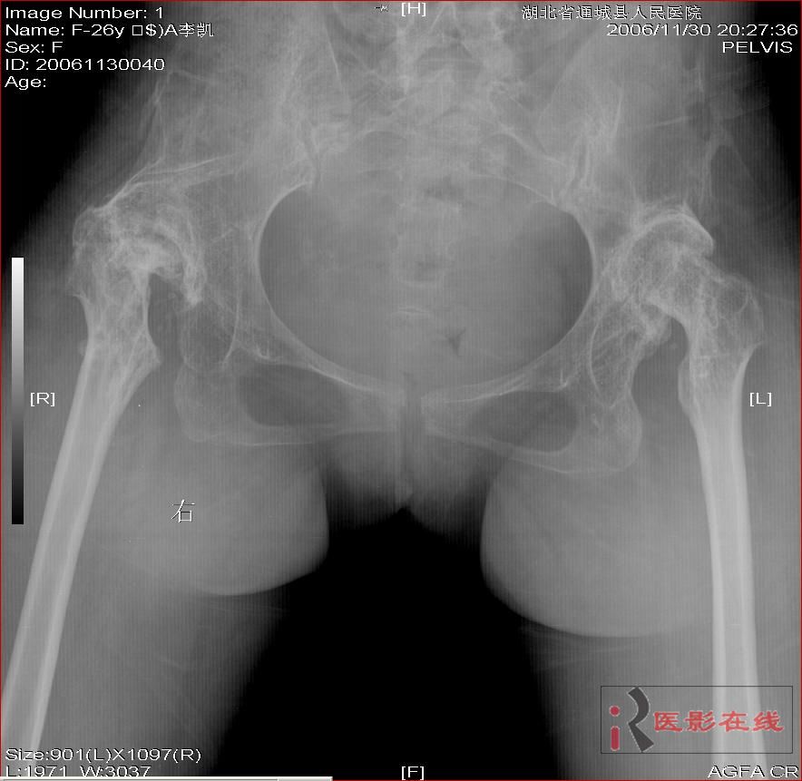 以下是引用杀毒软件在2008-3-19 17:56:00的发言:[br]双侧髋关节仍为脱位表现,假关节形成,部分已经强直,右股骨头碎裂,股骨干近端增粗。[br]结合手术史考虑:原地臼盖成形术后,髋关节退变,股骨头无菌性坏死,右股骨近端生长紊乱,骨质疏松。