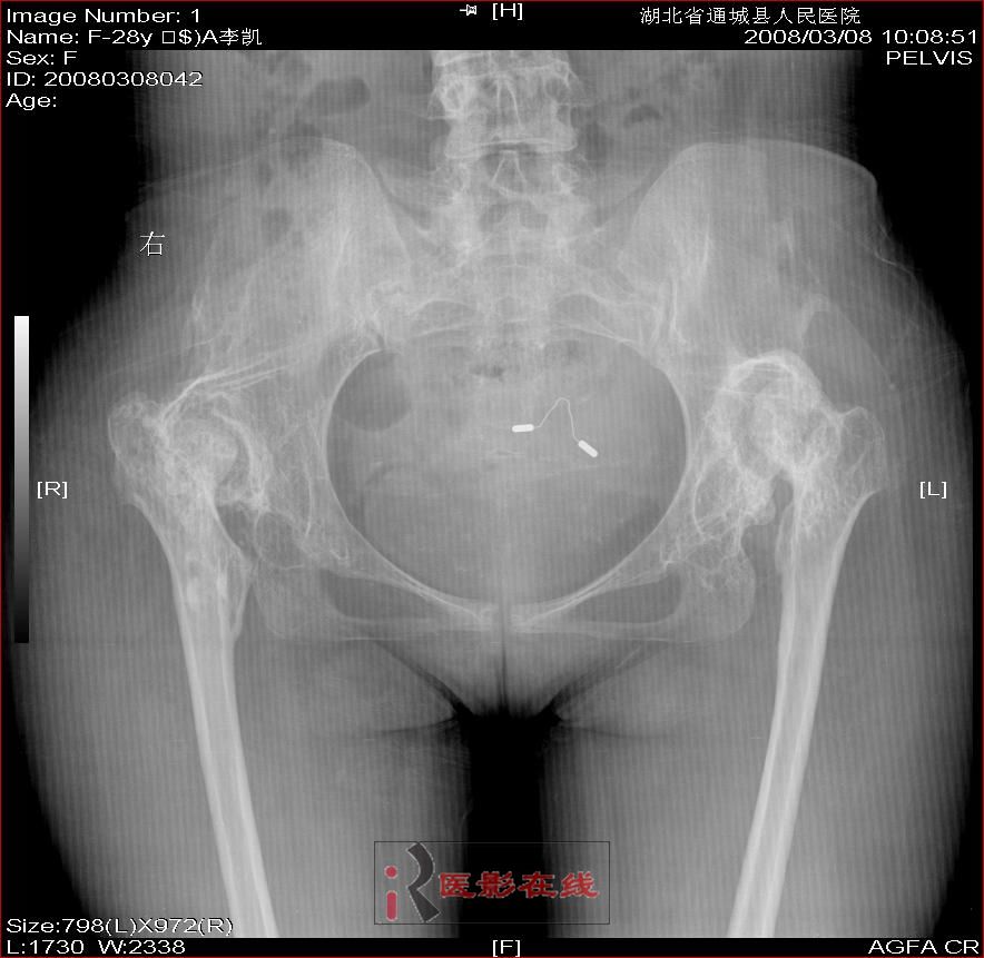 女 28岁 先天性髋关节脱位术后复查片(手术日期是2000年,数字化以前平片资料患者外带),现无其它不适,走路仍需双拐