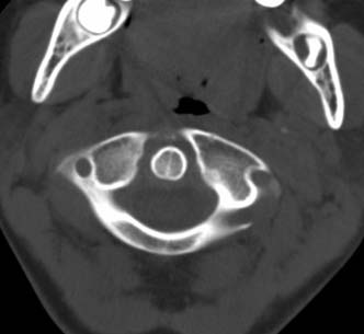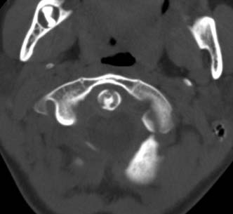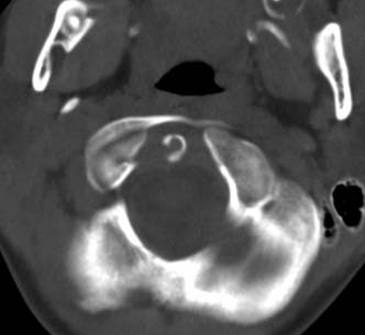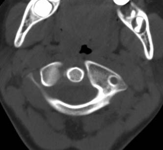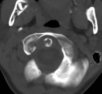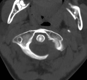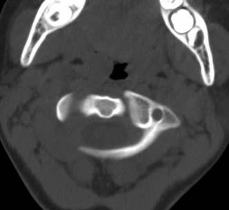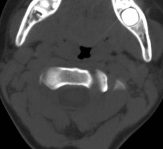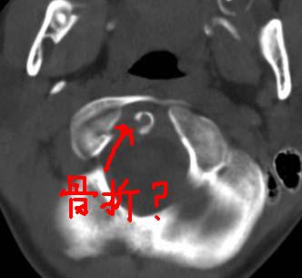 患者在校与同龄孩子打闹后(据家长说被拳击中颈部)出现颈部不适30分钟后入院检查,来时脖子歪斜。请大家看看枢椎齿状突及寰枢关节有问题吗?(3mm层厚断层扫描)。