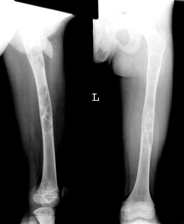 股骨干轻度膨胀,内有多个囊状透亮区及磨玻璃样影,右胫骨上端亦有小囊状影。