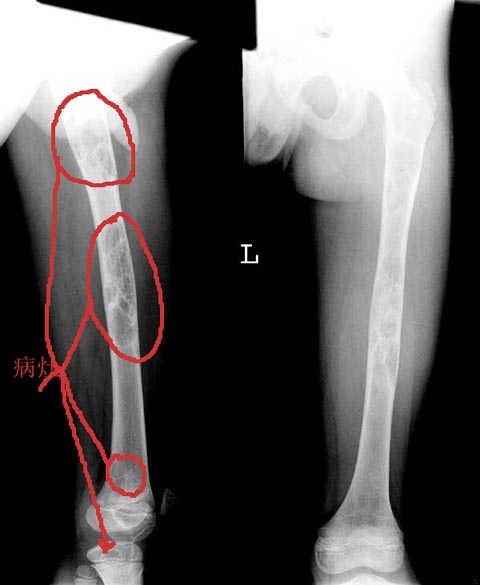 以下是引用kjgj在2005-4-20 19:49:40的发言:[br]股骨干较大范围膨胀性骨破坏[两处] ,其内见丝瓜瓤改变,皮质变薄,[br][br][br] 骨纤维异常增殖征