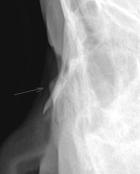未见明显骨折征像,箭头所示为软组织包块,可能是骨膜下血肿所致