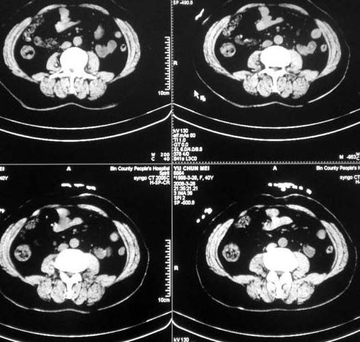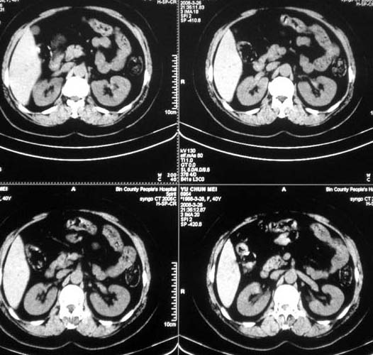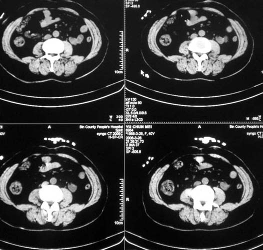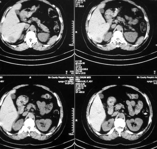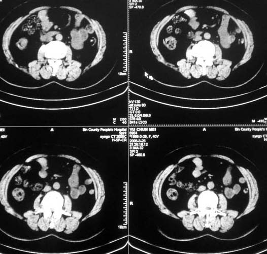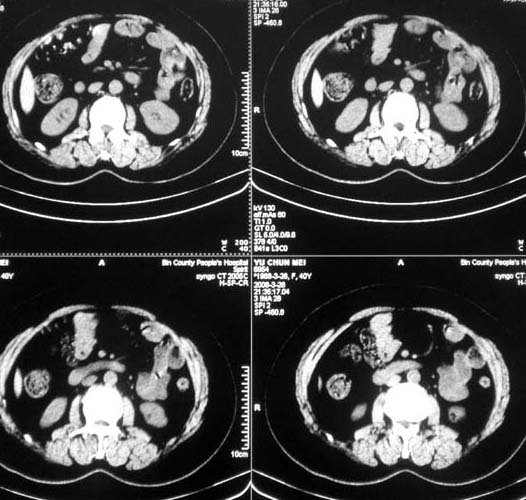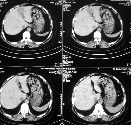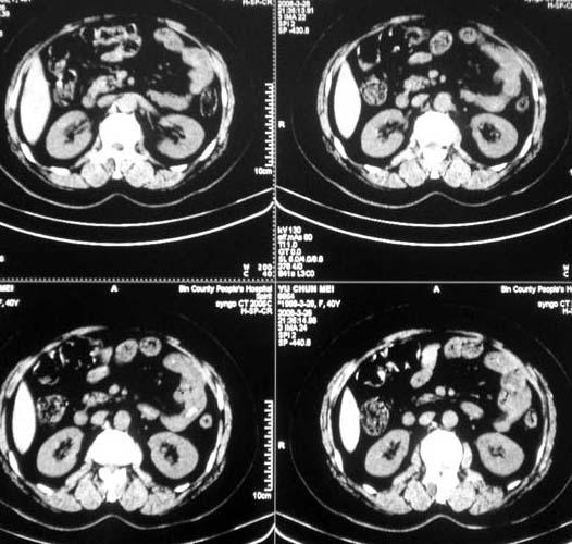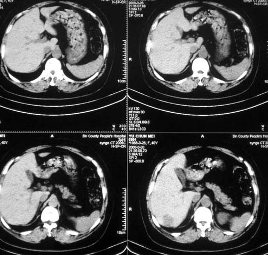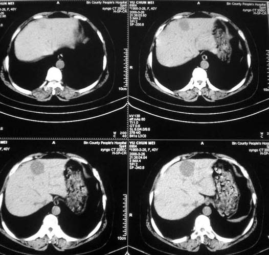女,56岁,和上两个是同一病人,腹痛,胀痛,消化不良,五年前有血管瘤。密度减低影ct值为40hu。