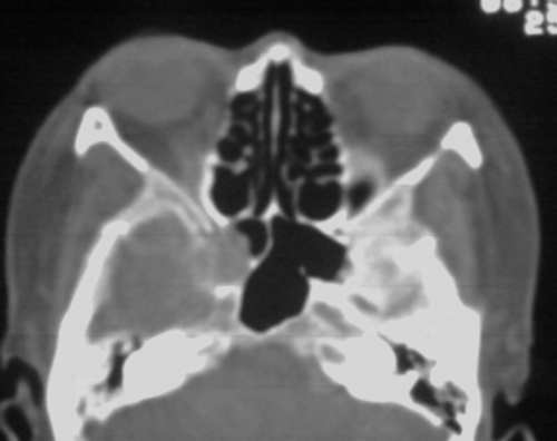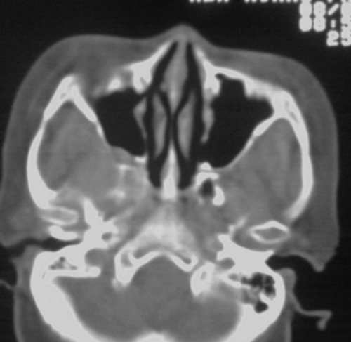 以下是引用jiangjing在2008-3-28 14:09:00的发言:[br]右侧蝶骨大翼骨质破坏,骨质破坏区内为软组织密度影填塞,右侧翼腭窝似有扩大,右侧乳突部分蜂房密度增高;疑鼻咽部肿瘤。建议:行鼻咽部ct扫描检查。另:右侧上颌窦黏膜下囊肿(或息肉)。