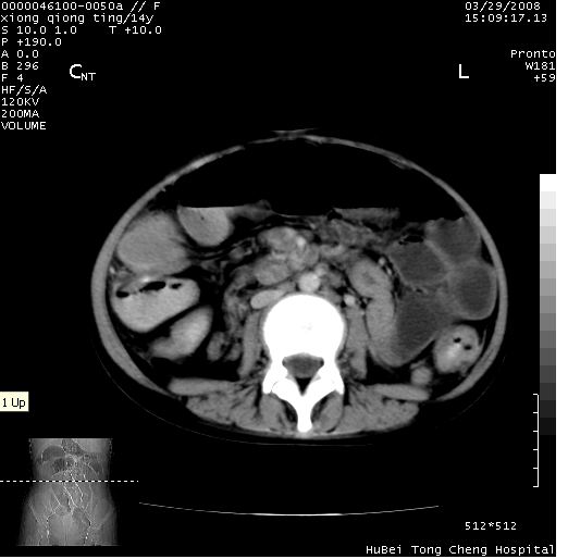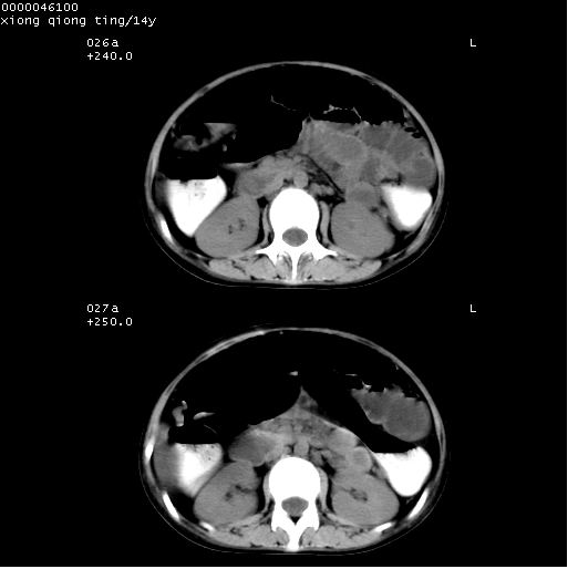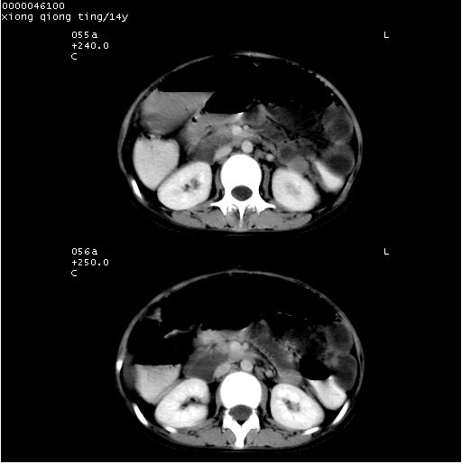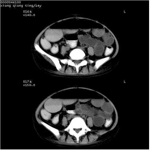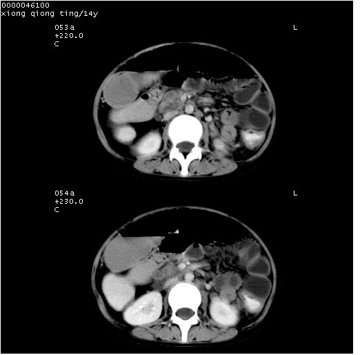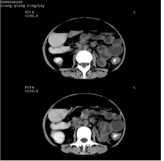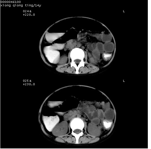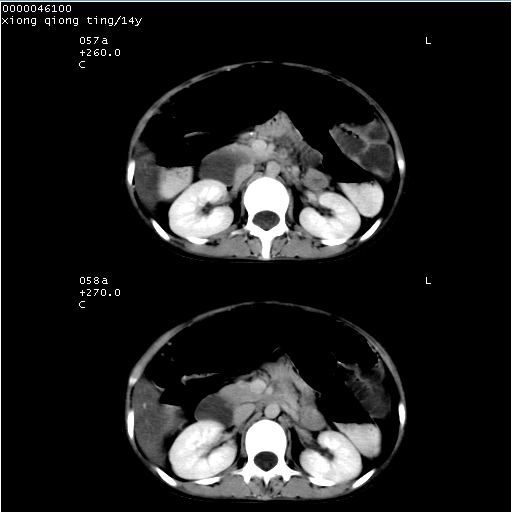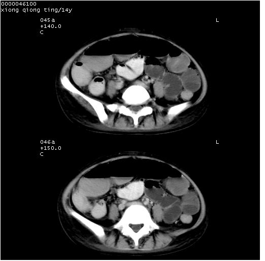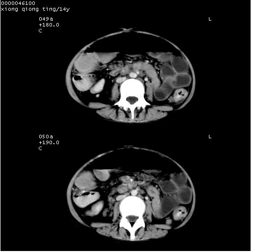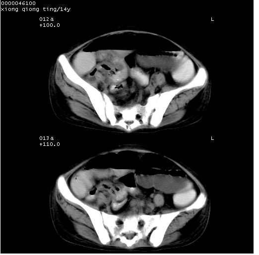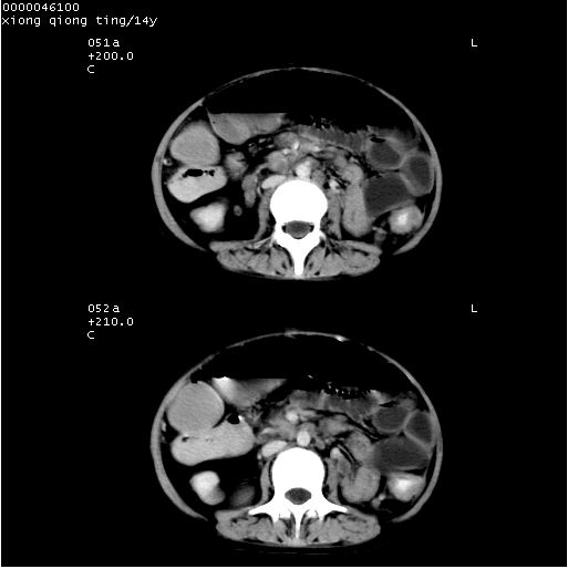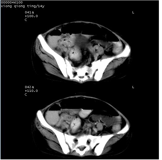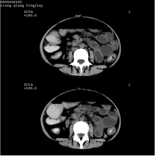 中下腹及盆腔ct轴位扫描(ps+ce)提示:腹部肠管明显充气扩张,并见数个不同宽度之气液平面;疑不全性肠梗阻或肠郁张。临床会诊考虑为患儿腹泻,肠郁张所致;后来未经特殊处理,患儿大便恢复正常,亦无腹胀。