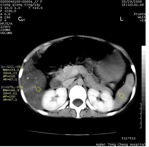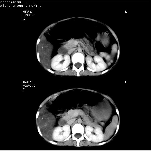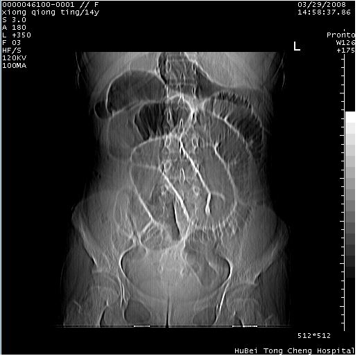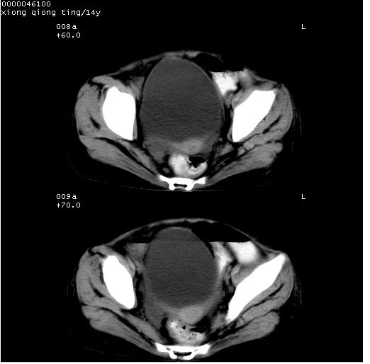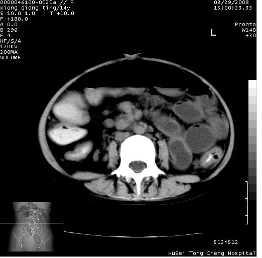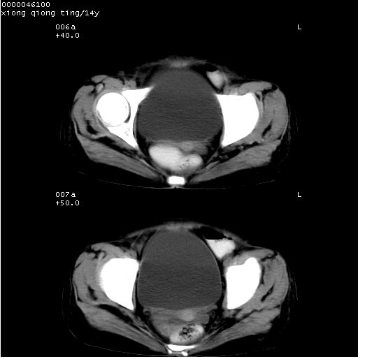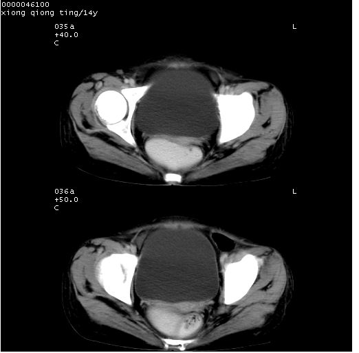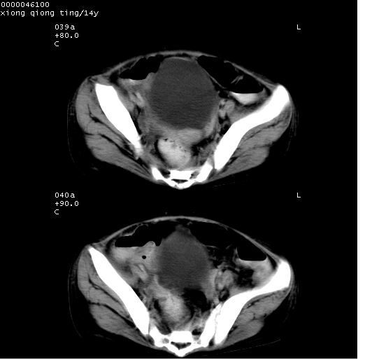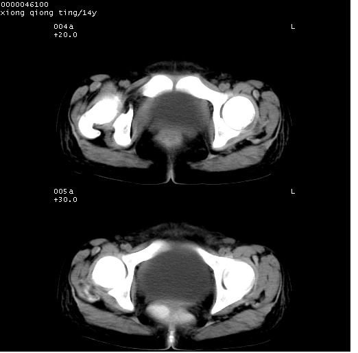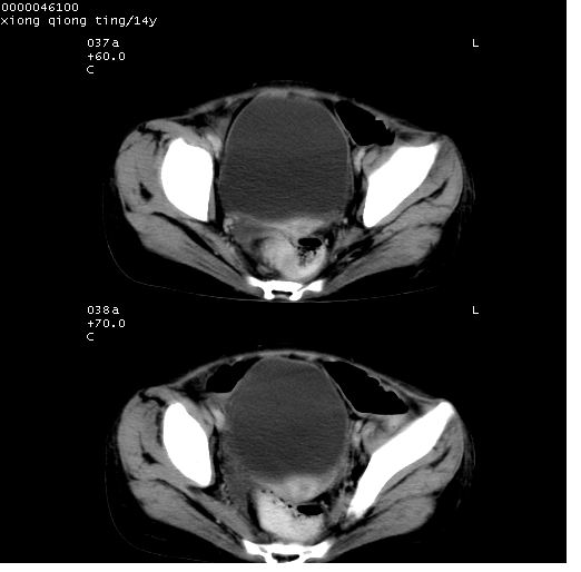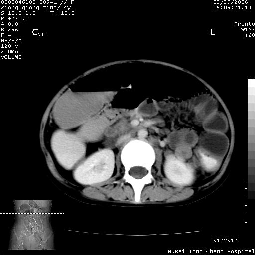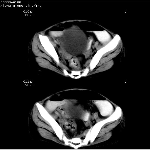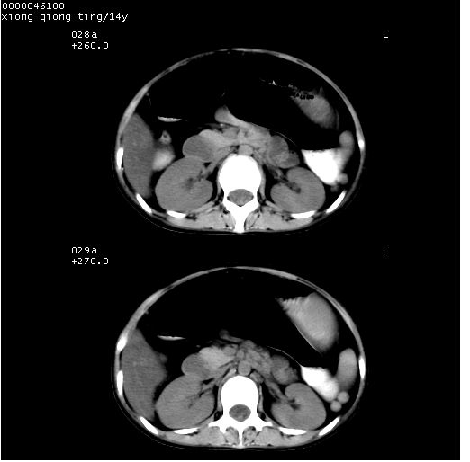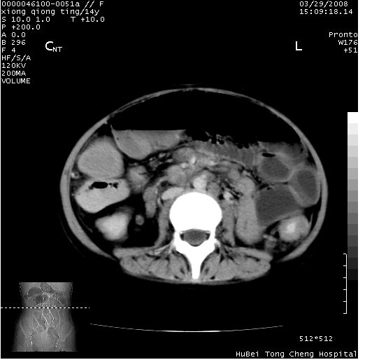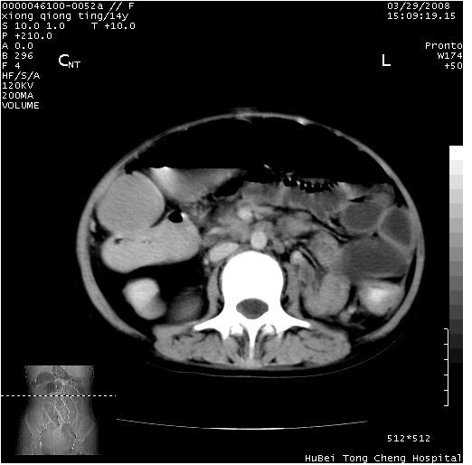 中下腹及盆腔ct轴位扫描(ps+ce)提示:腹部肠管明显充气扩张,并见数个不同宽度之气液平面;疑不全性肠梗阻或肠郁张。临床会诊考虑为患儿腹泻,肠郁张所致;后来未经特殊处理,患儿大便恢复正常,亦无腹胀。