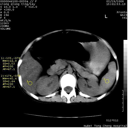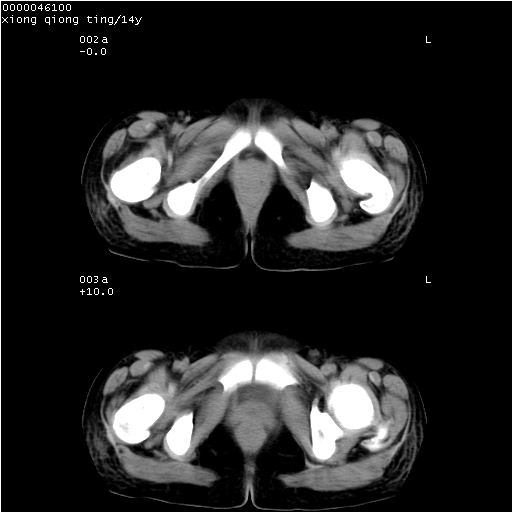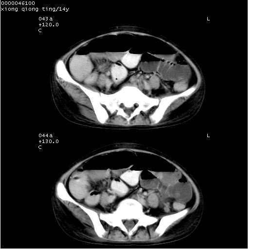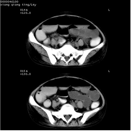 (注:患儿检查当日上午9时口服胃肠道对比剂,下午3时许行ct扫描检查,未行对比剂直肠保留灌肠,检查当日患儿腹泻)