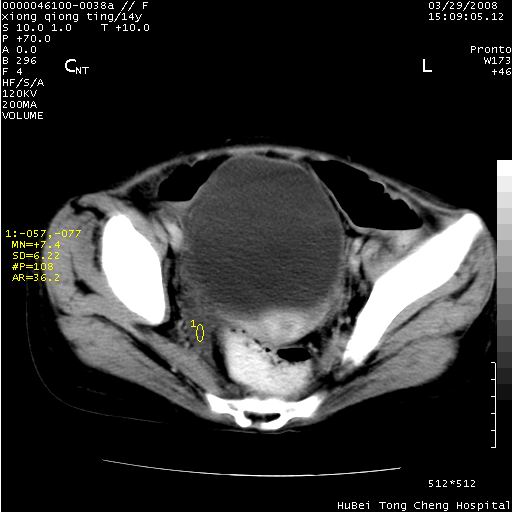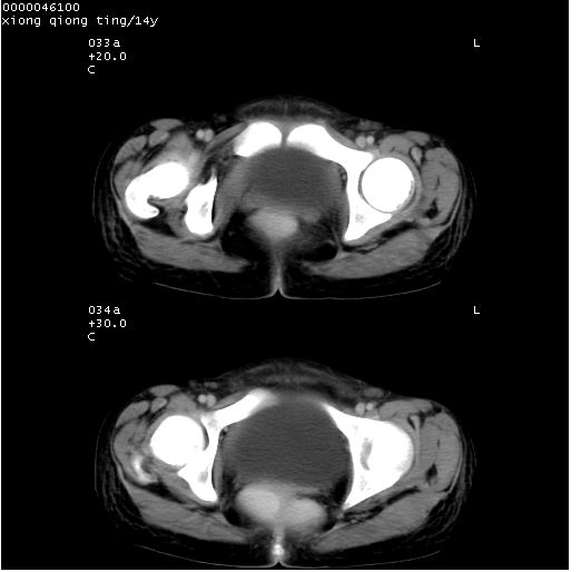 中下腹及盆腔ct轴位平扫+增强扫描(层厚10mm,螺距1.0,重建间隔10mm),图像如下: