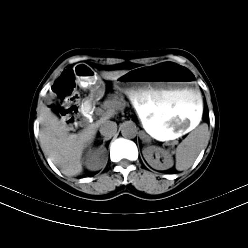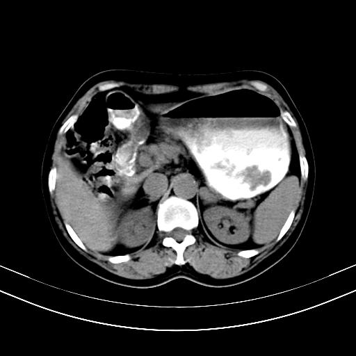 胃内的充盈缺损,当时让患者俯卧位在扫描一下就 好了,当然最好是增强扫描,肝脏的病灶平扫很难定性,可以考虑是肝癌·血管瘤·转移瘤!