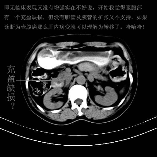 胃内的充盈缺损,当时让患者俯卧位在扫描一下就好了,增强扫描,肝脏的病灶平扫很难定性.