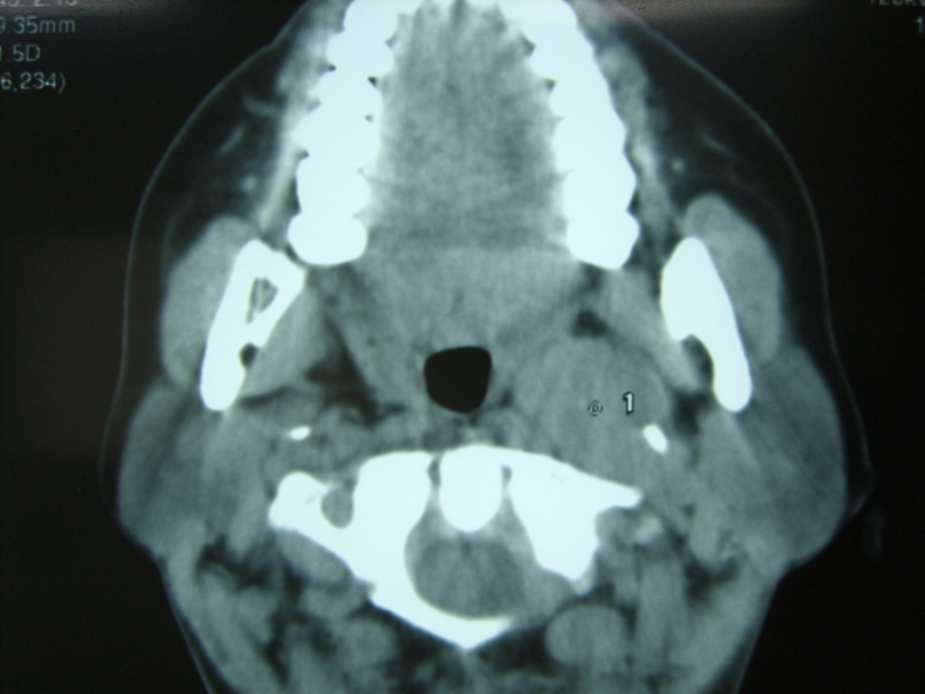 女,48岁,左颈部增粗,不适一年,伴左侧面麻.