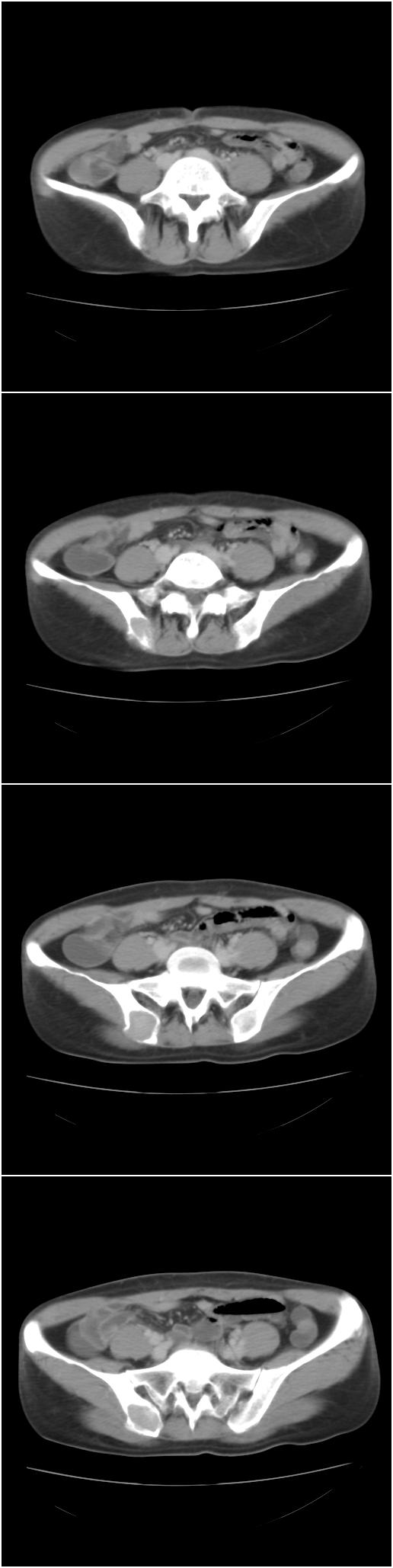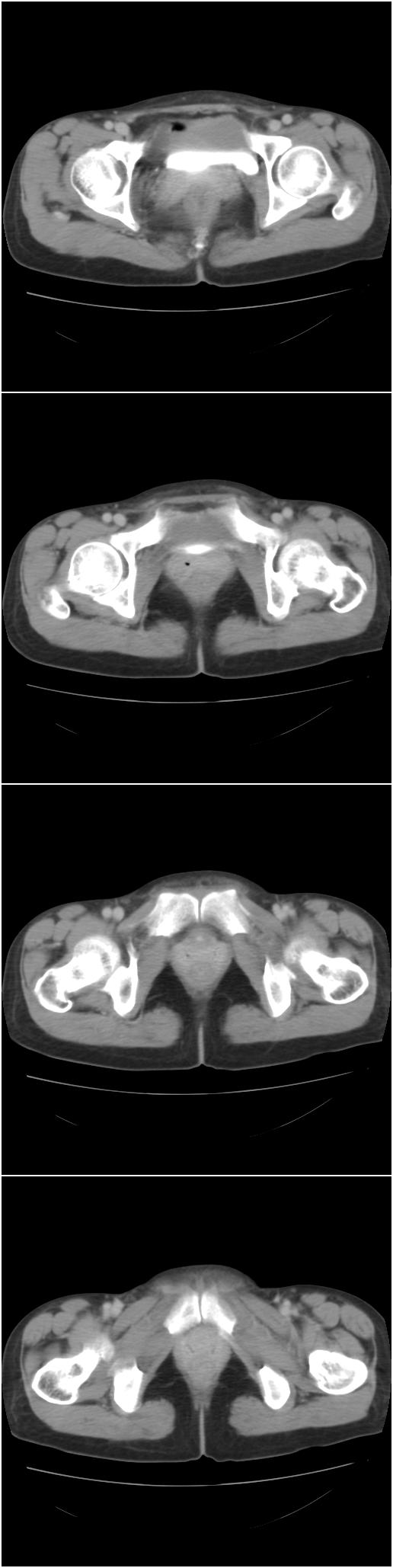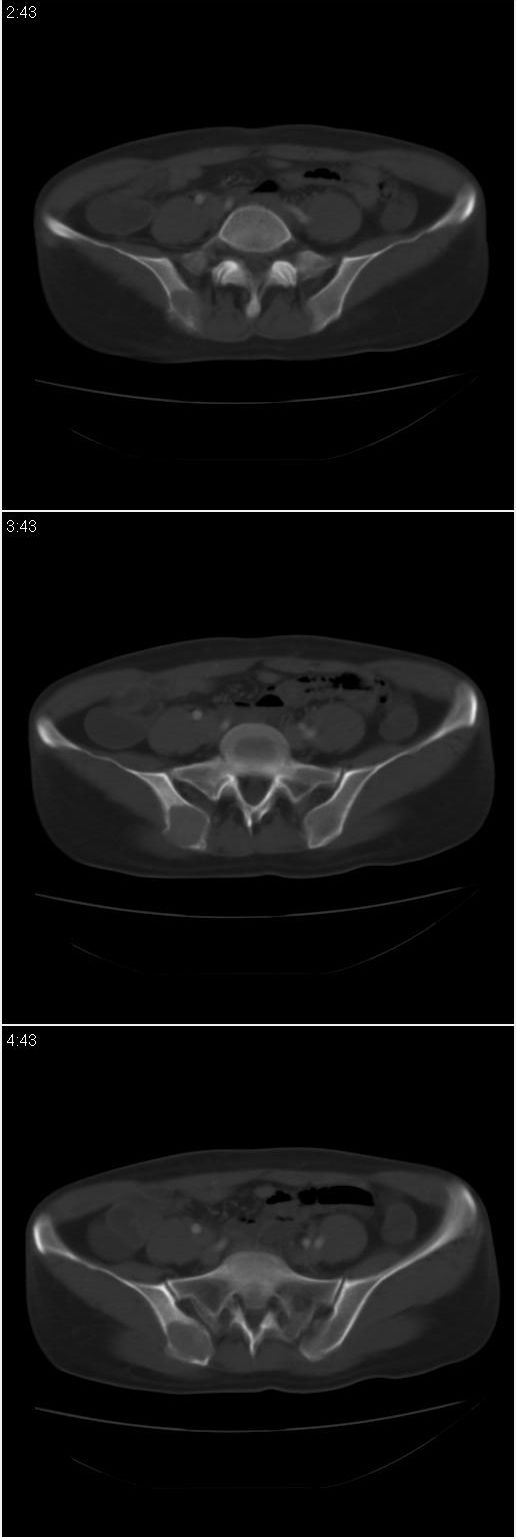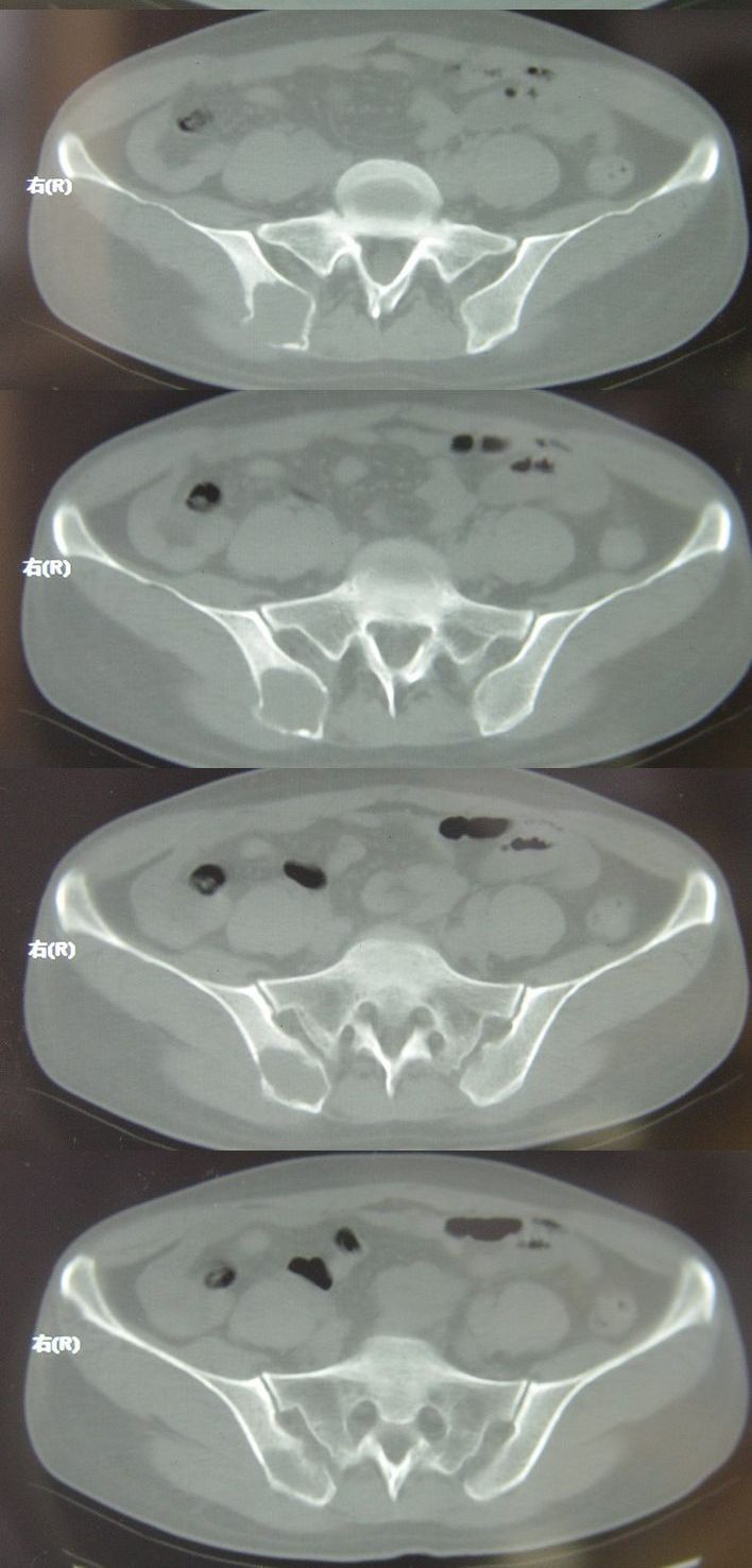 标题: CT13002:女,46岁。有子宫肌瘤手术史,现在出现右臀部向腿