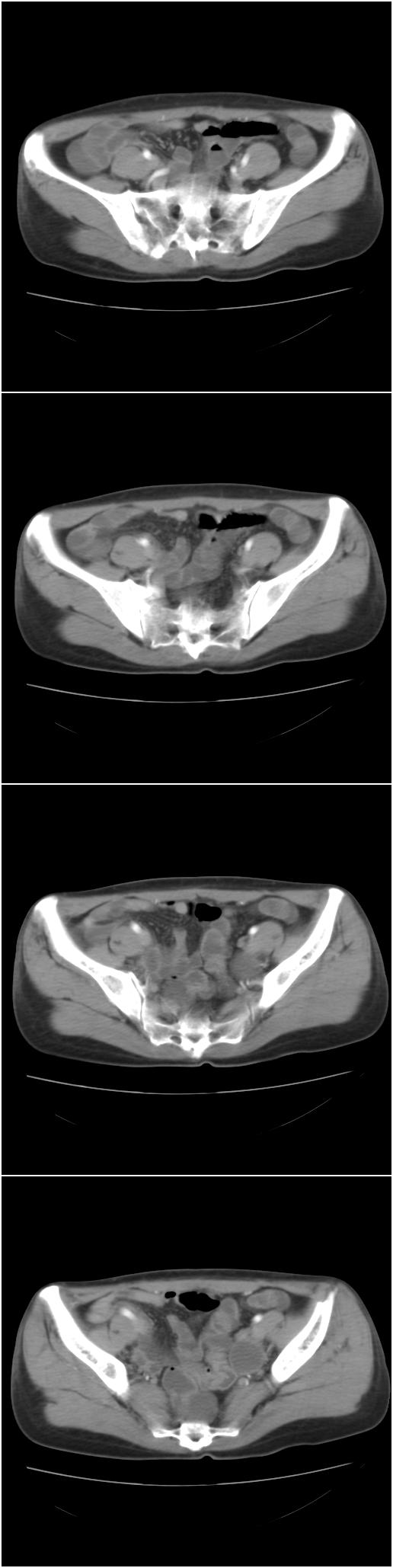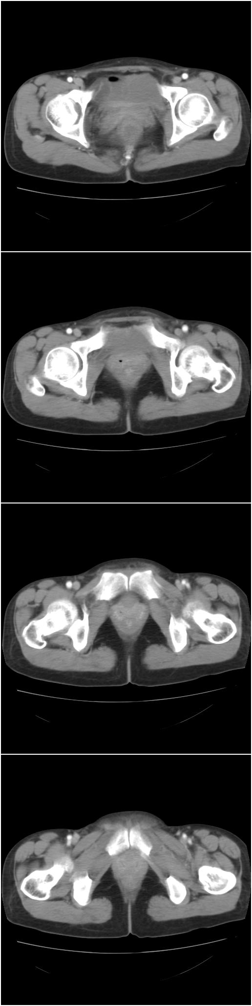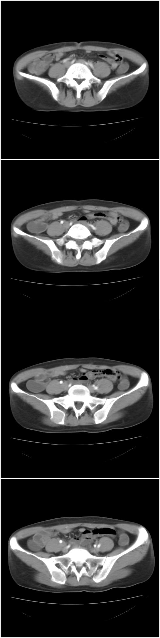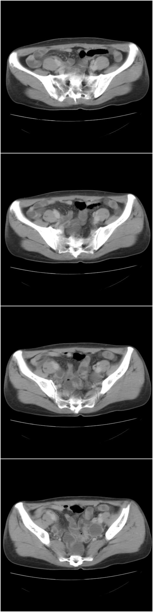 标题: CT13002:女,46岁。有子宫肌瘤手术史,现在出现右臀部向腿