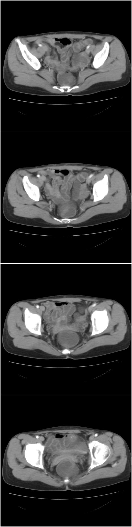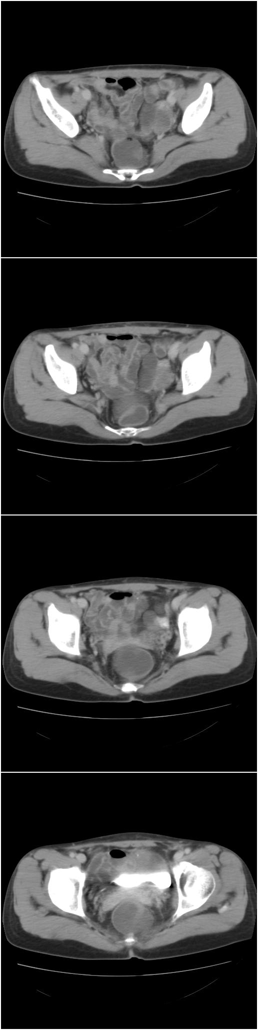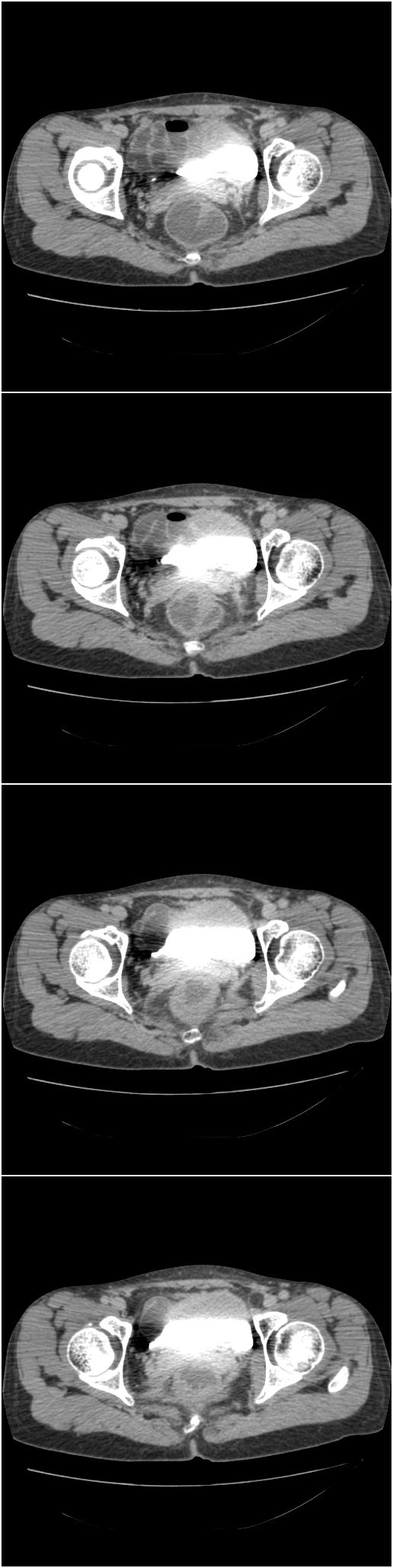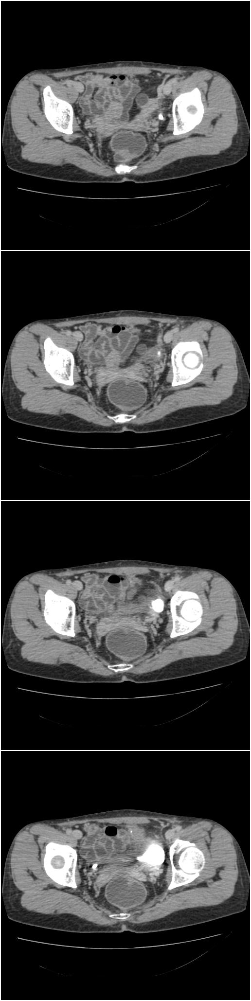 标题: CT13002:女,46岁。有子宫肌瘤手术史,现在出现右臀部向腿