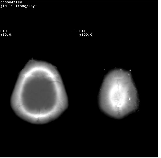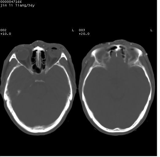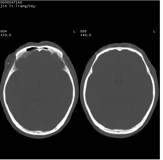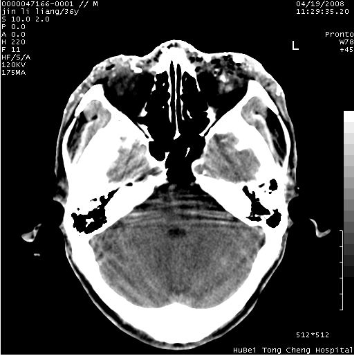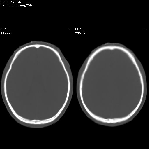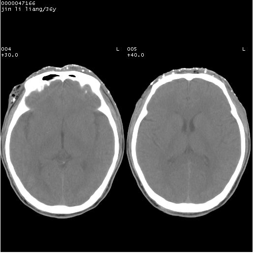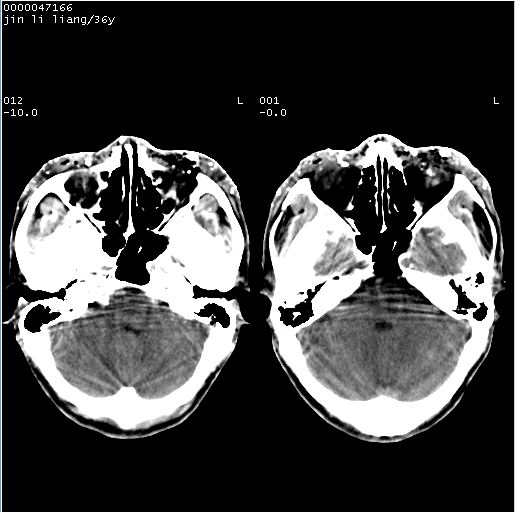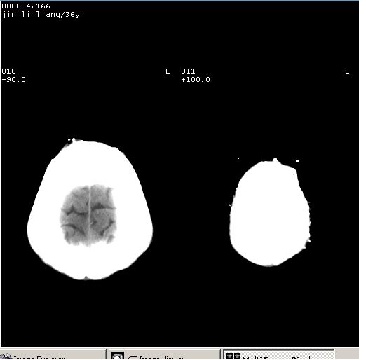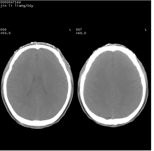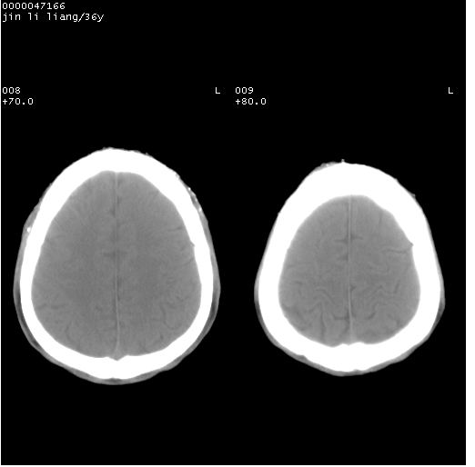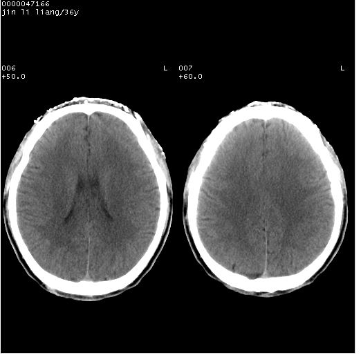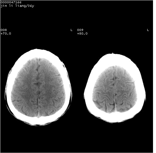 颅脑ct轴位平扫(层厚、层距均为10mm),图像如下: