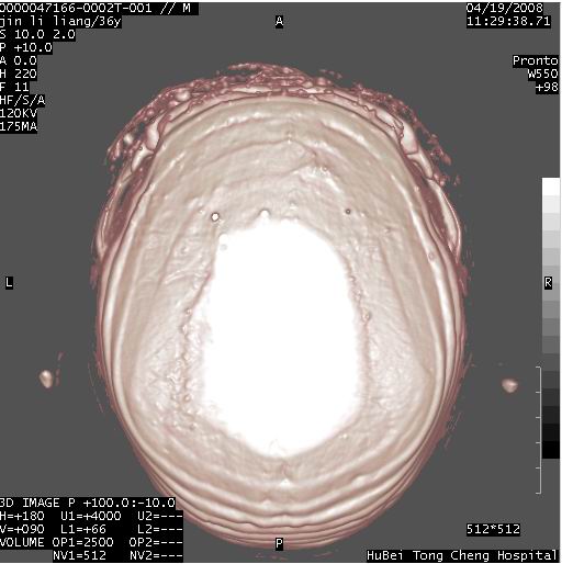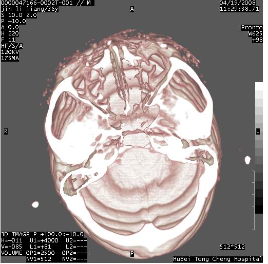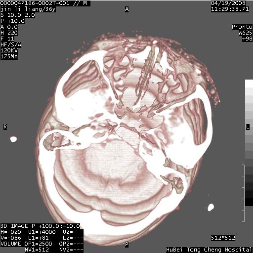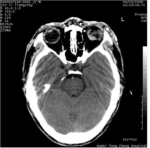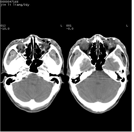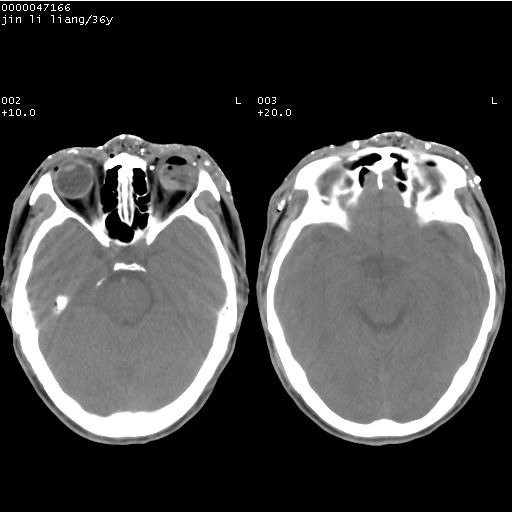 迎面一炮,满脸开曝。额顶部头皮及软组织挫伤并异物,左眼球破裂积气并异物,典型的面目全非,惨不忍睹。