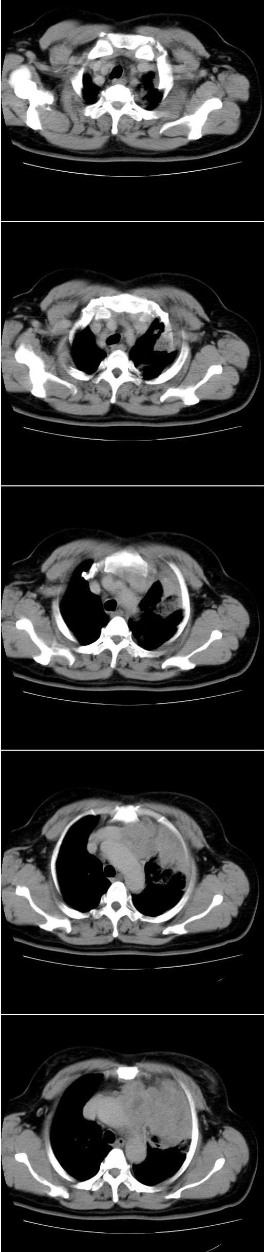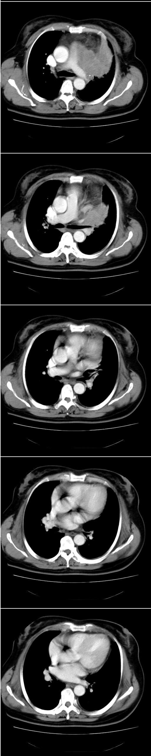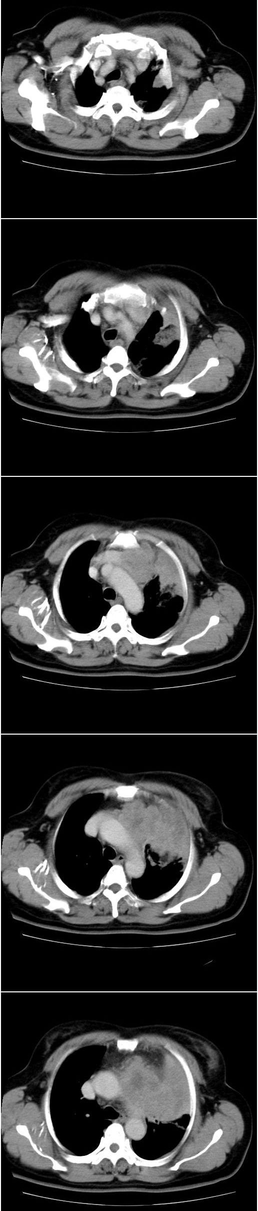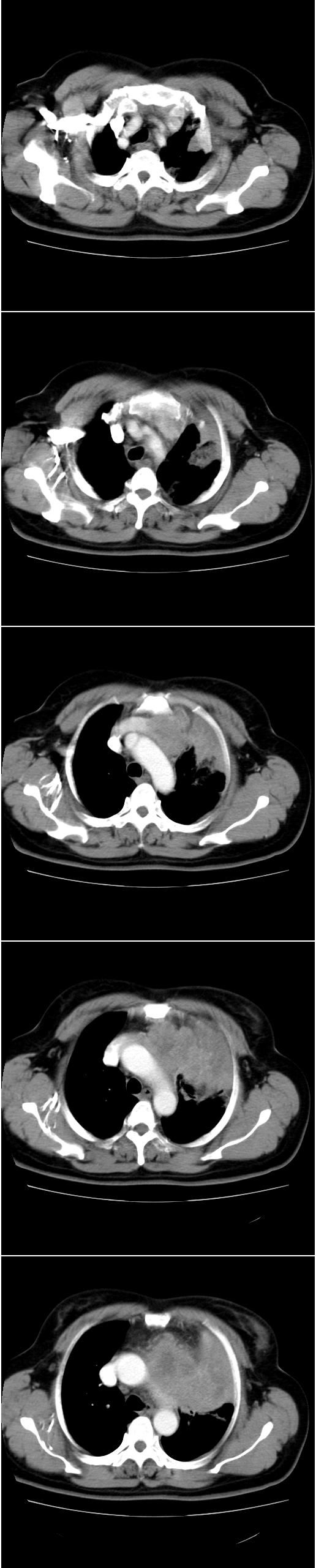 以下是引用余辉在2008-4-23 19:05:00的发言:[br]考虑左上肺癌(周围型)伴左肺门及纵隔转移(主肺动脉窗旁病灶可能为肿大并坏死的淋巴结),不除外纵隔型肺癌