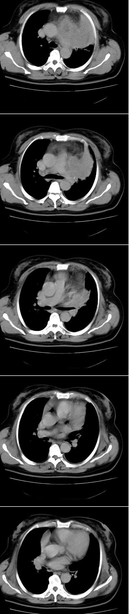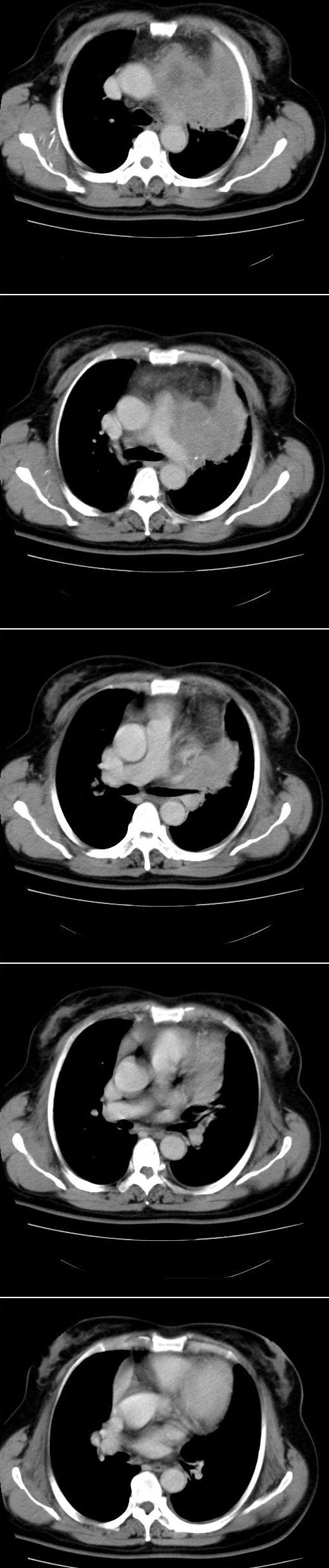 考虑左侧中央型肺癌伴左肺上叶肺不张及前纵隔淋巴转移。